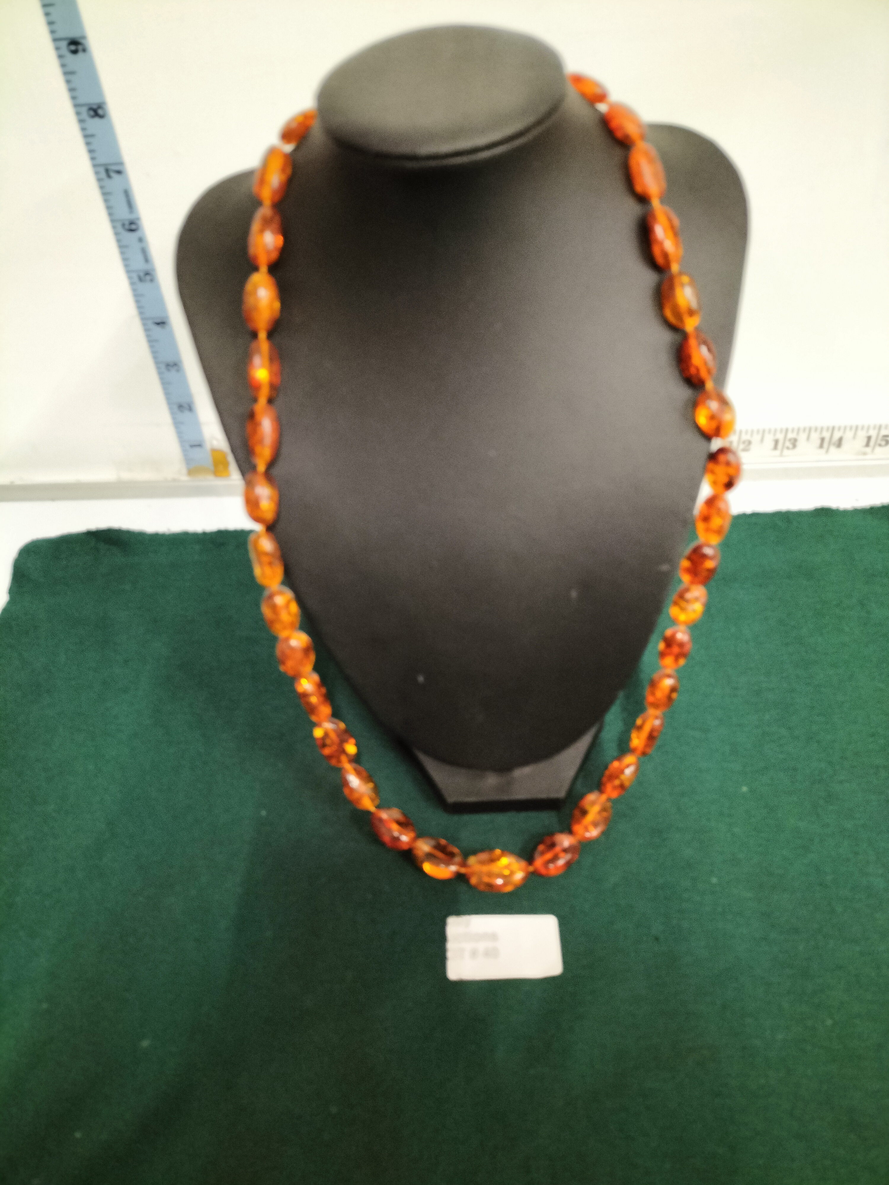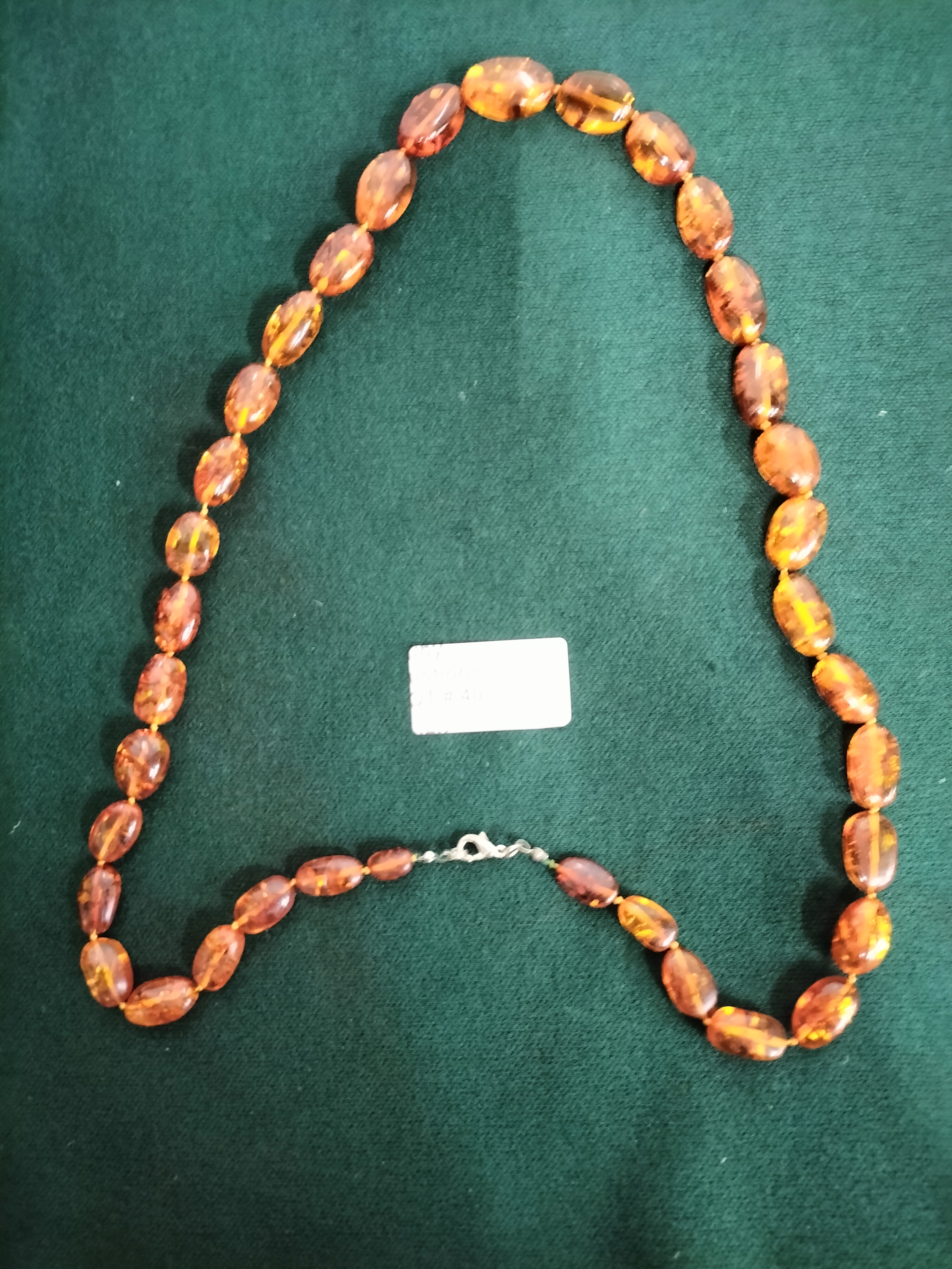 A necklace featuring translucent cognac-coloured amber oval beads with a metal lobster claw clasp, measuring approximately 60cm in length.