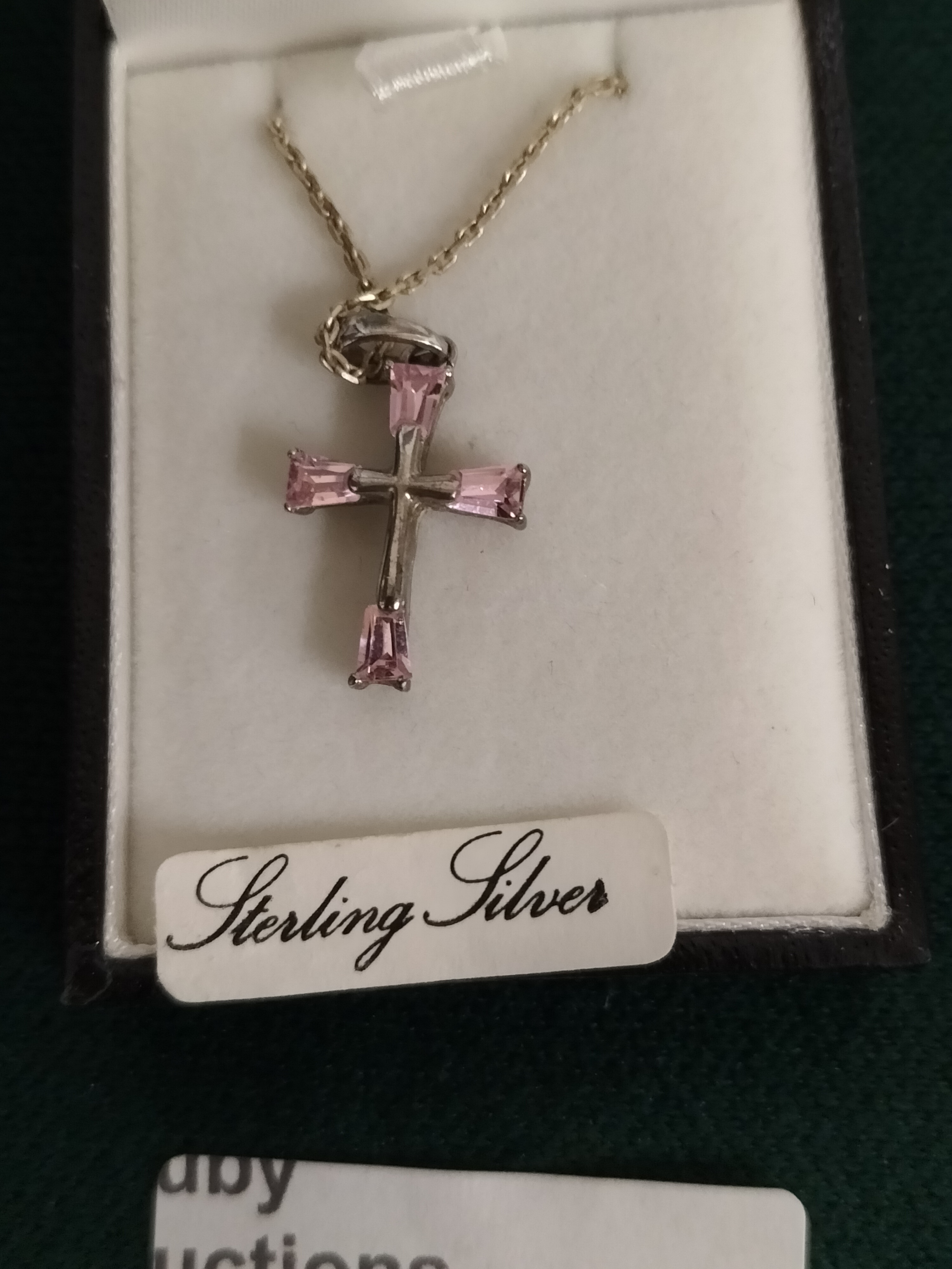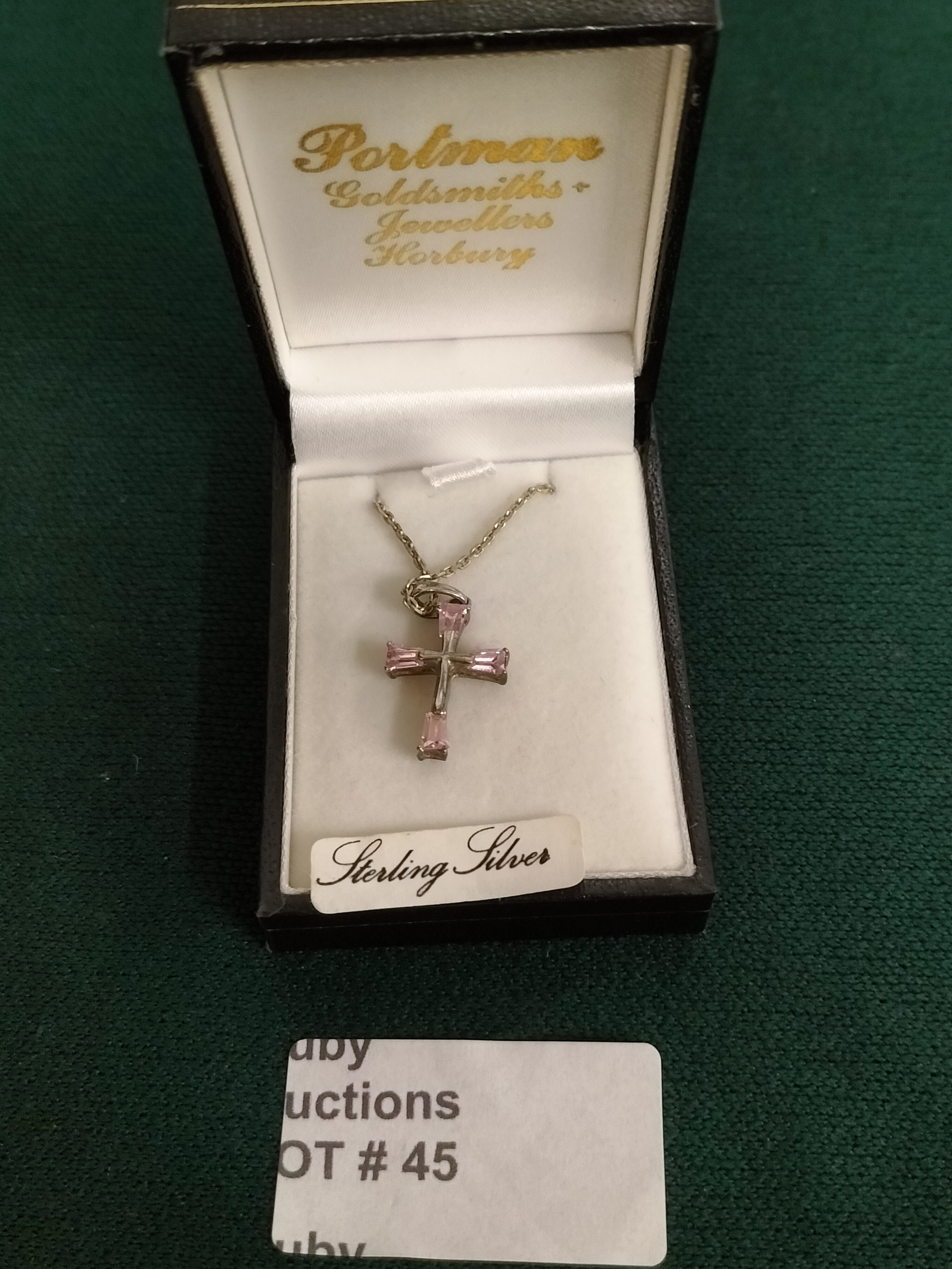 A sterling silver necklace featuring a cross pendant set with four rectangular pink stones, presented in a Portman Goldsmiths jewellery box.