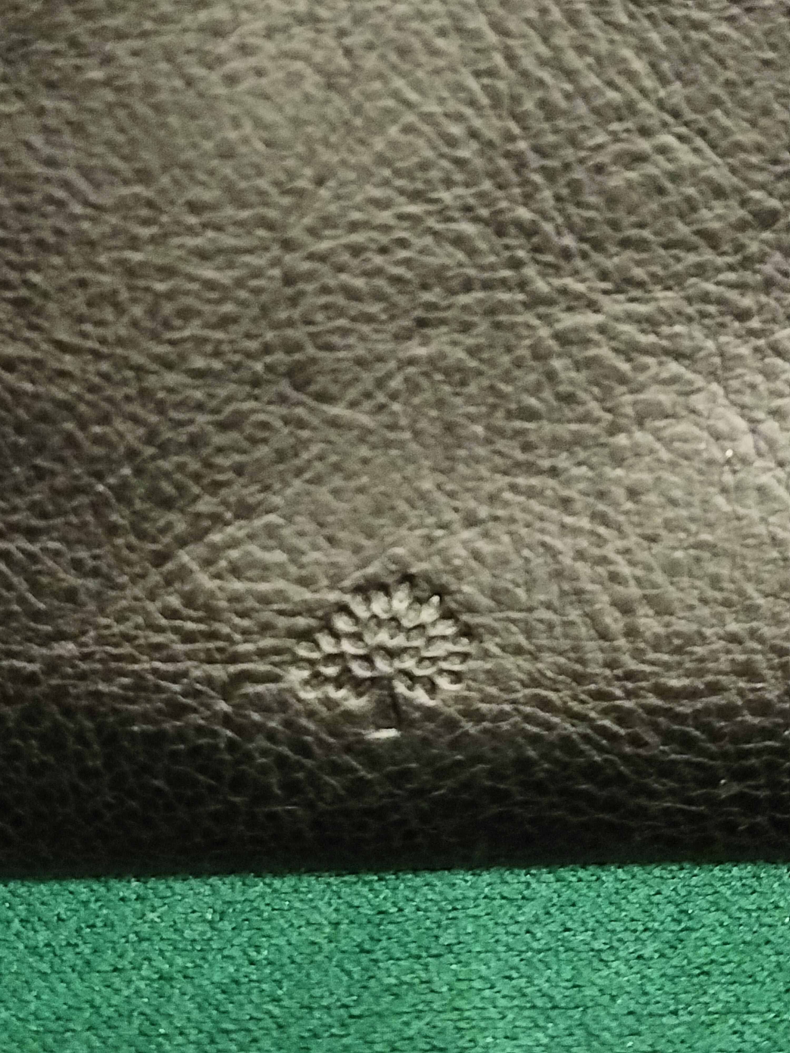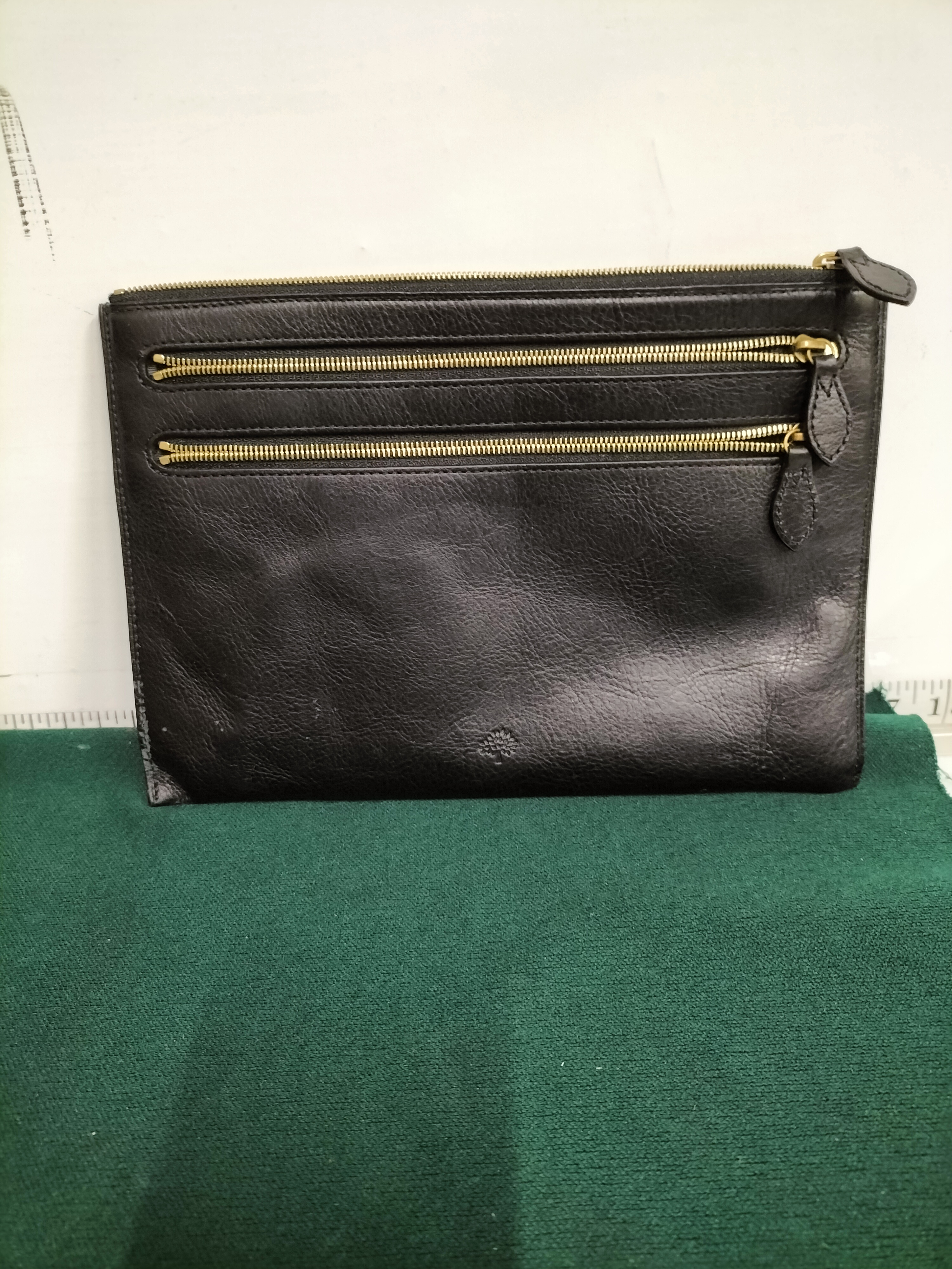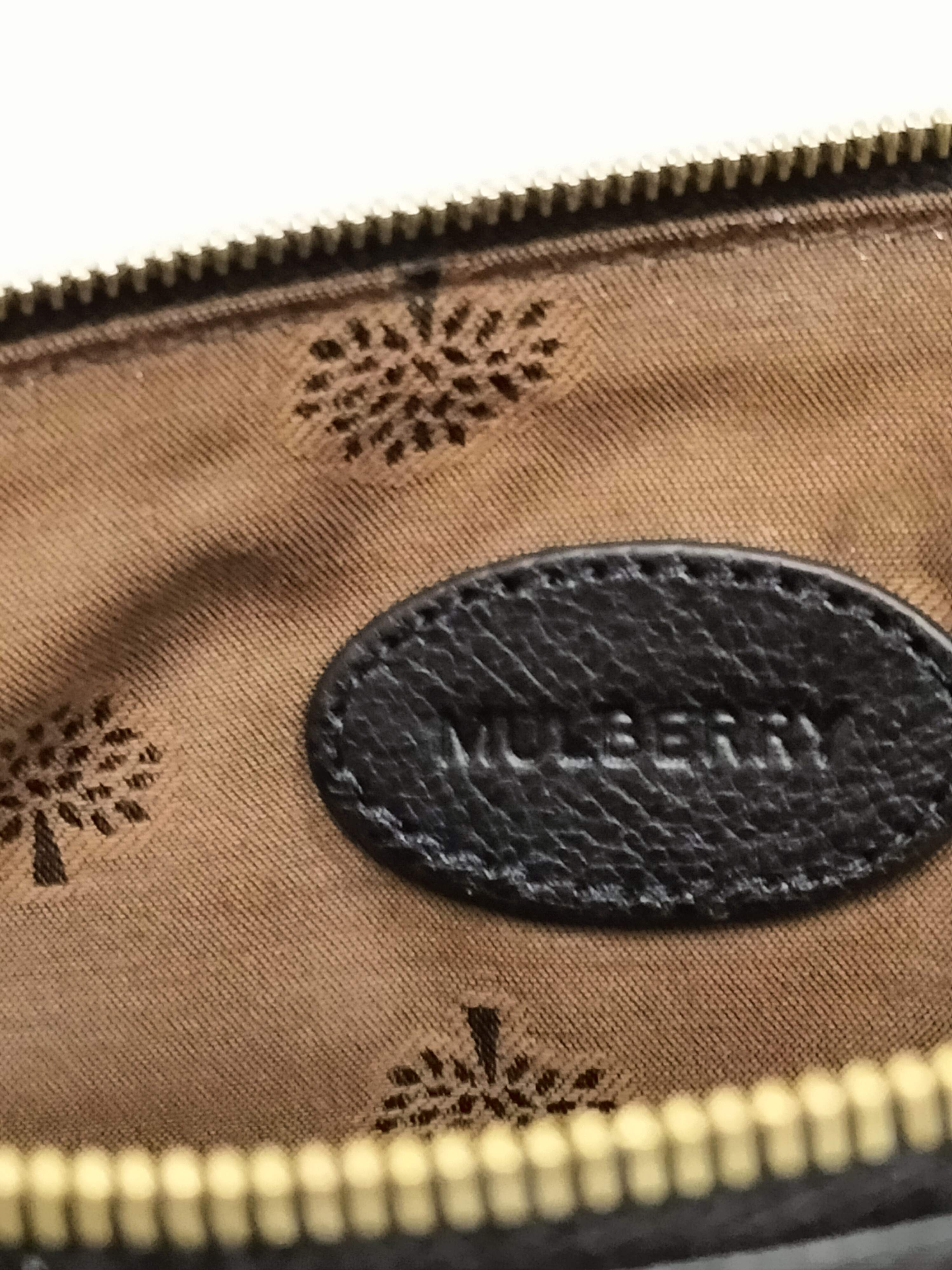 A Mulberry black leather zipped pouch featuring three external zip compartments, an embossed tree logo to the exterior, and an interior leather patch marked Mulberry.