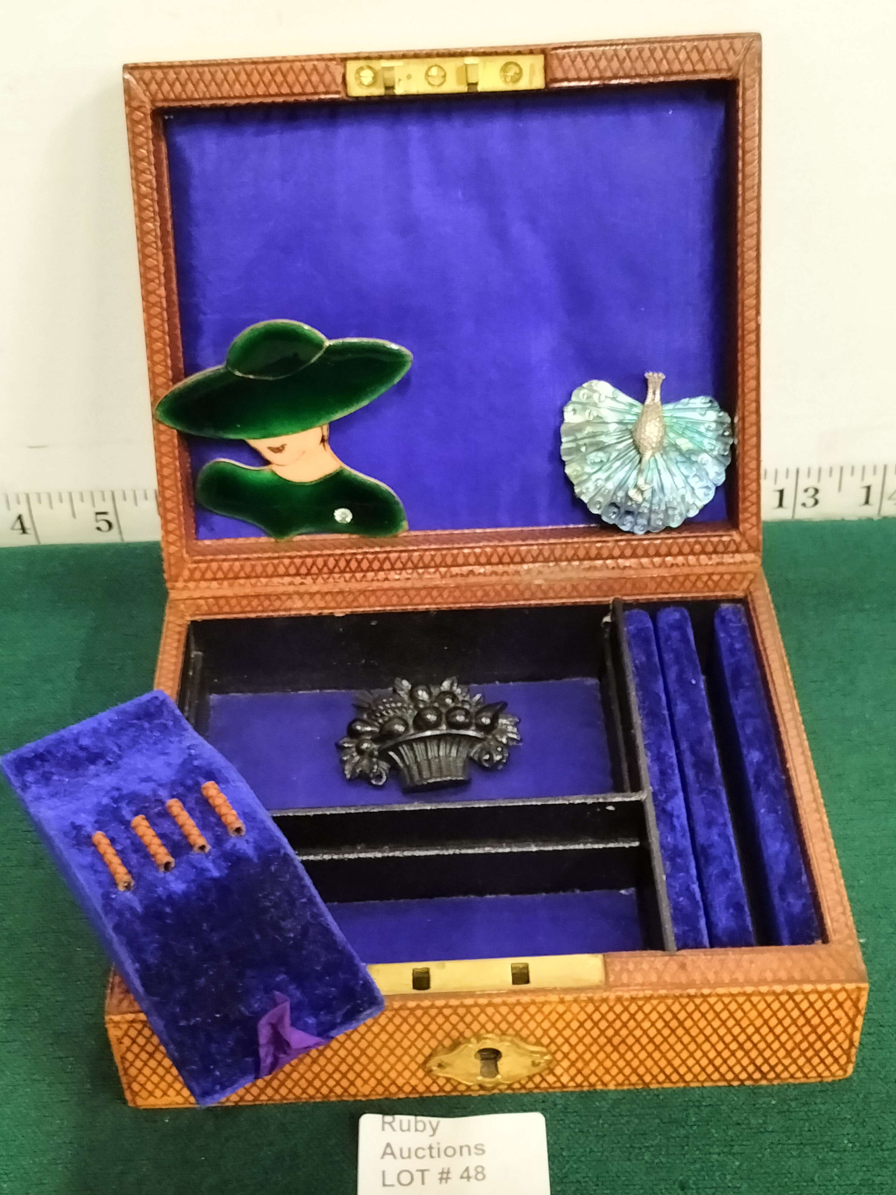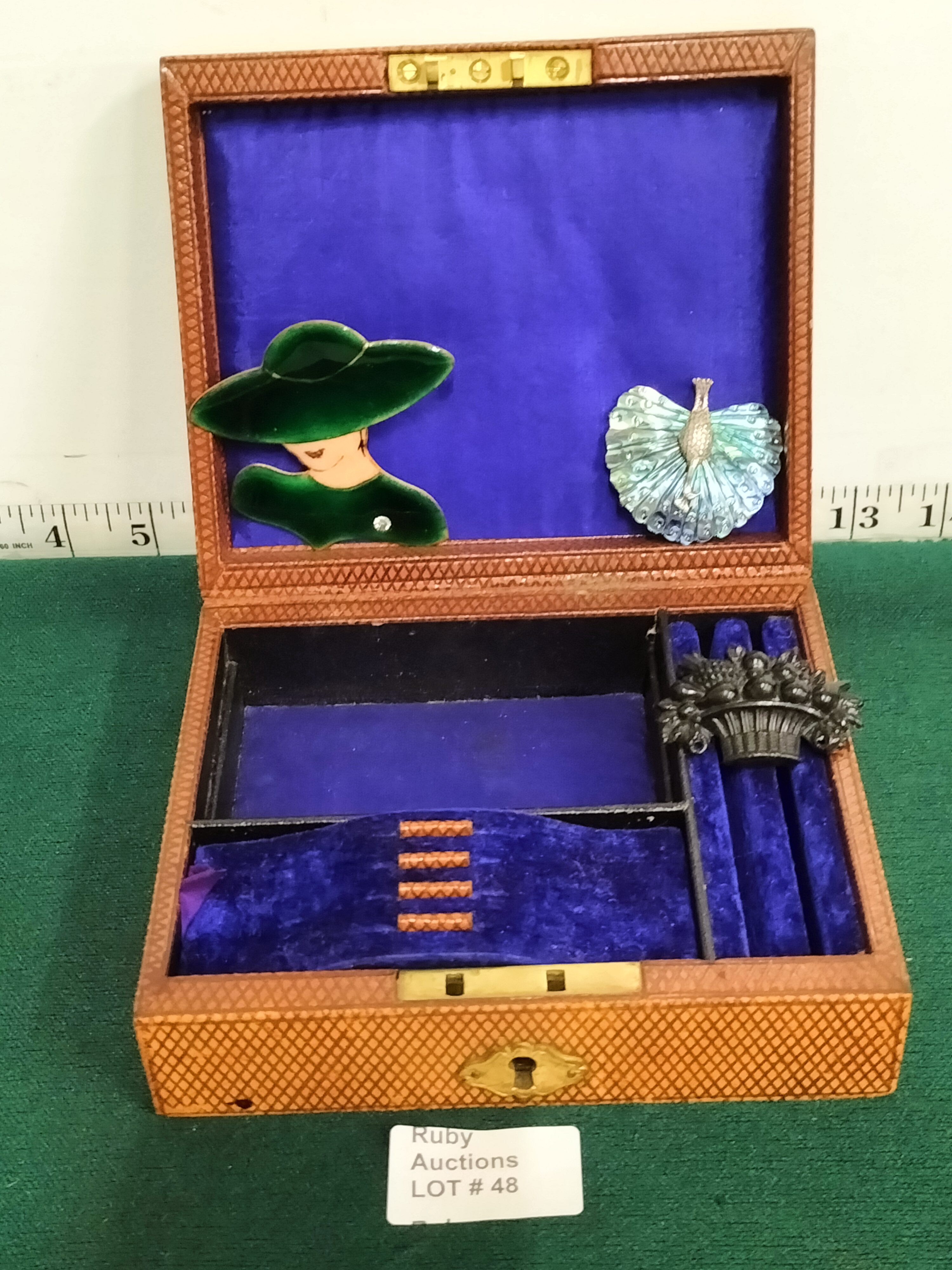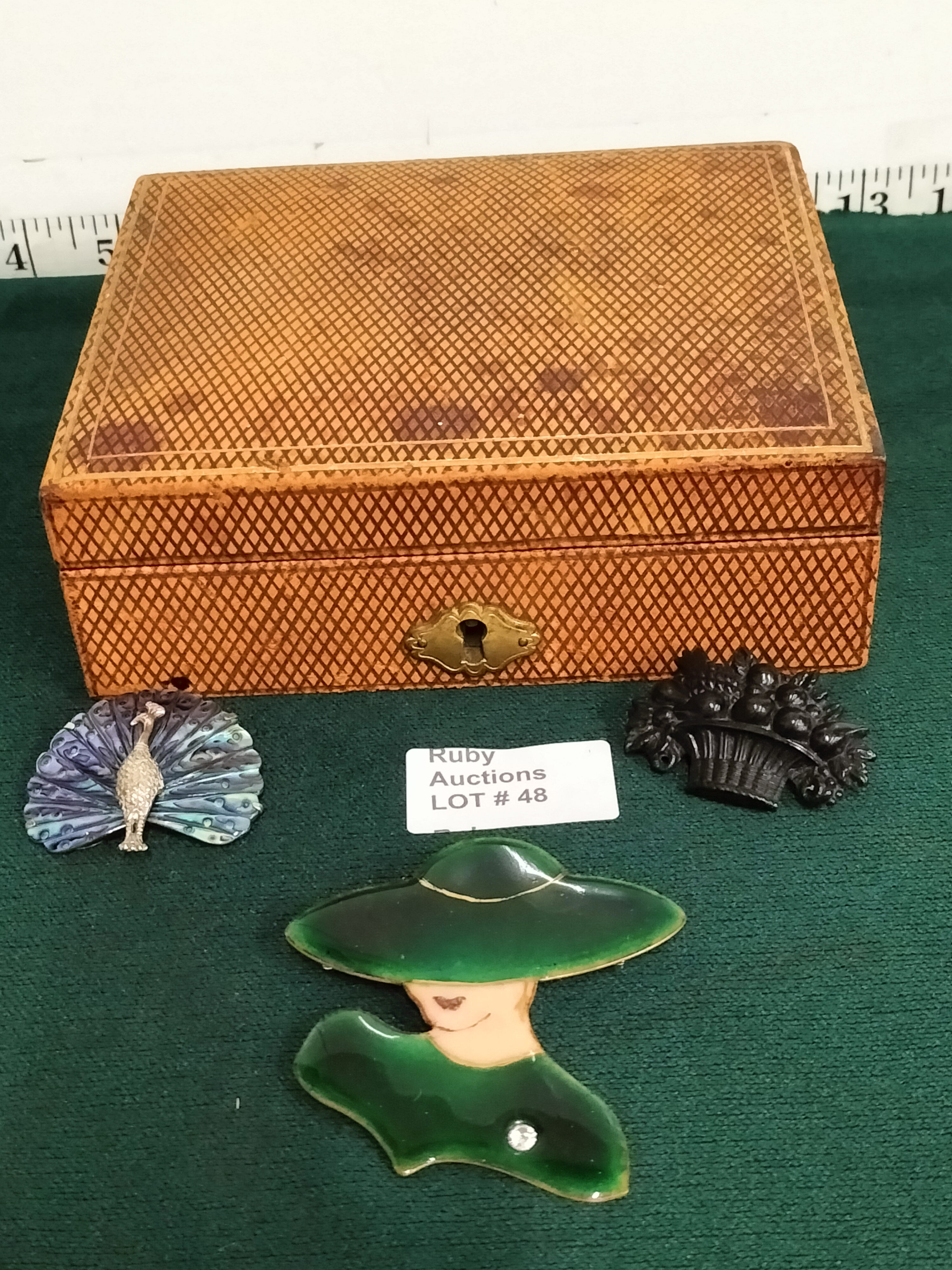 A tan diamond-patterned Antique jewellery box with a blue velvet interior, measuring approximately 5 inches wide, containing several brooches including a green enamel-style woman’s profile, a blue-toned peacock, and a black textured floral basket, ranging from 1.5 to 2.5 inches in length.