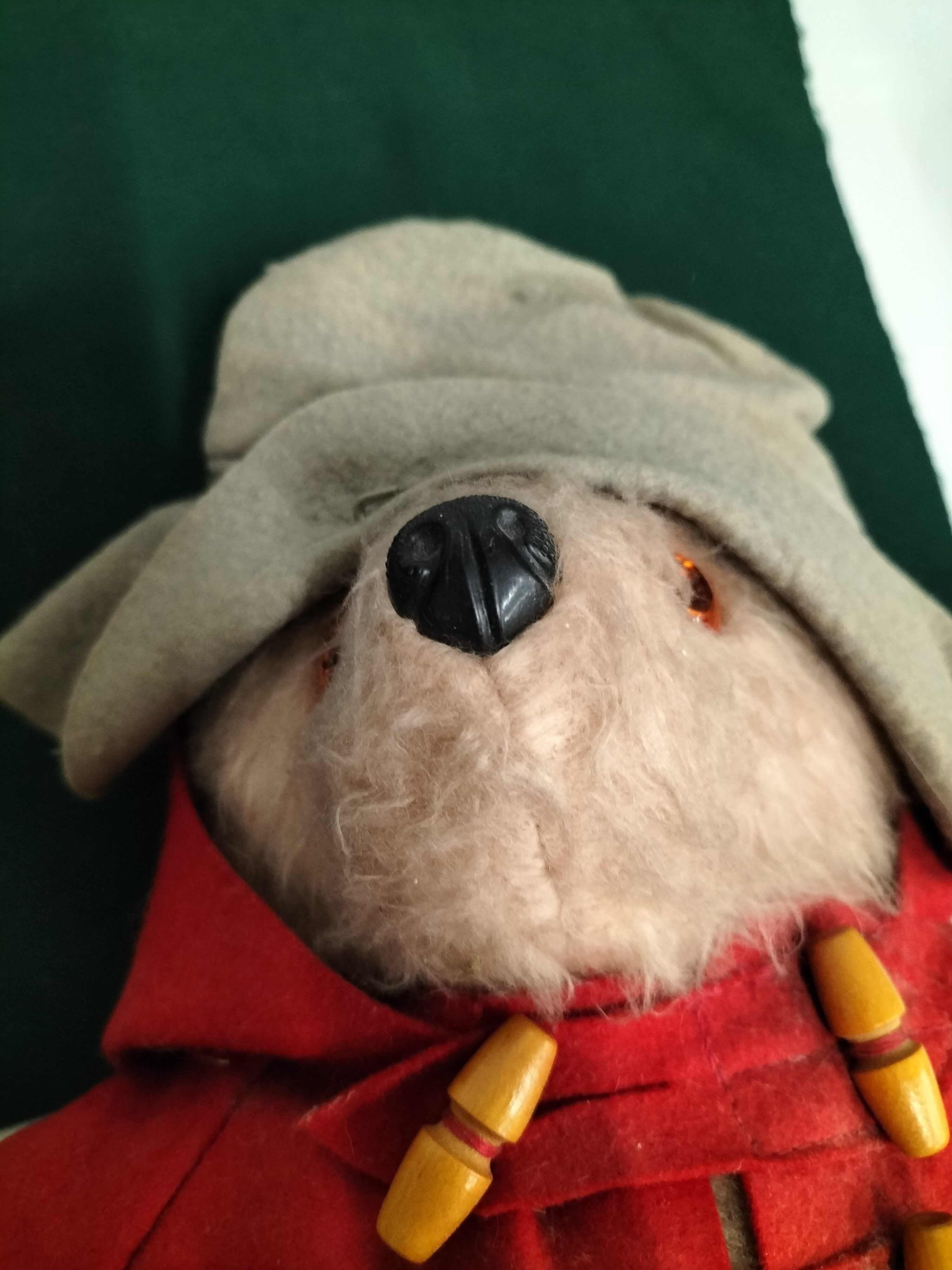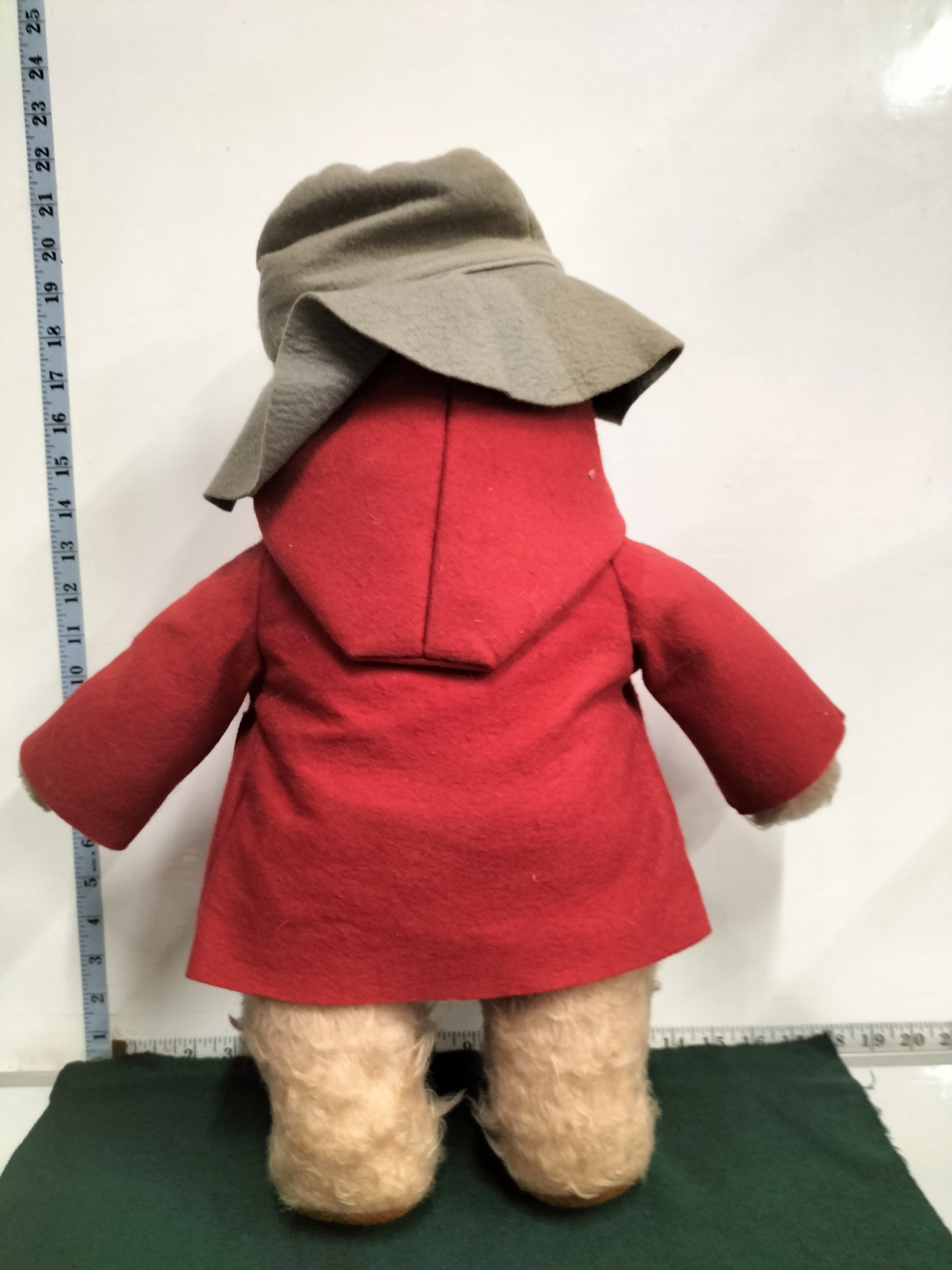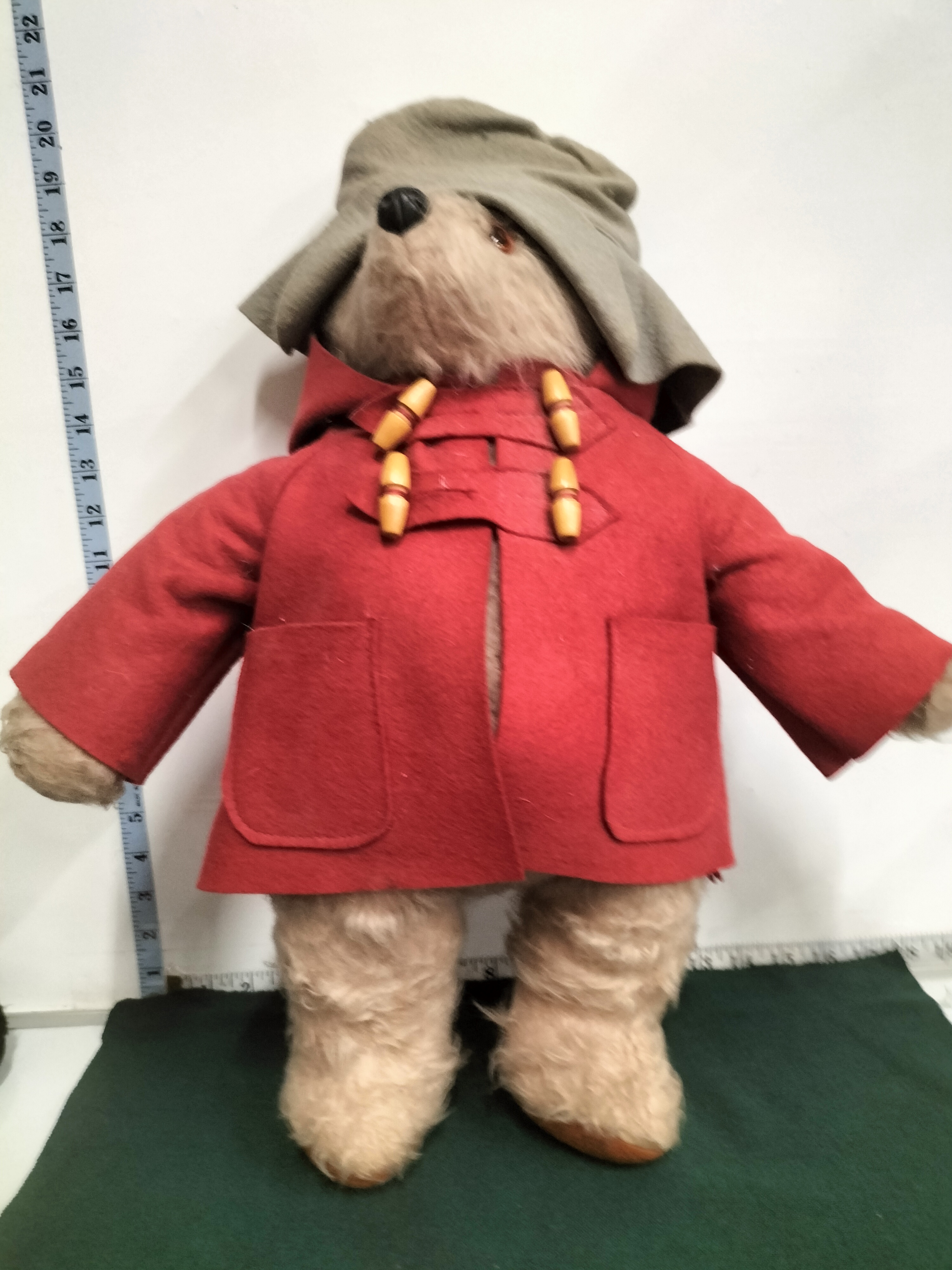 A tan plush Paddington Bear wearing a red felt duffel coat with yellow toggles and a grey felt hat, measuring approximately 48cm in height.