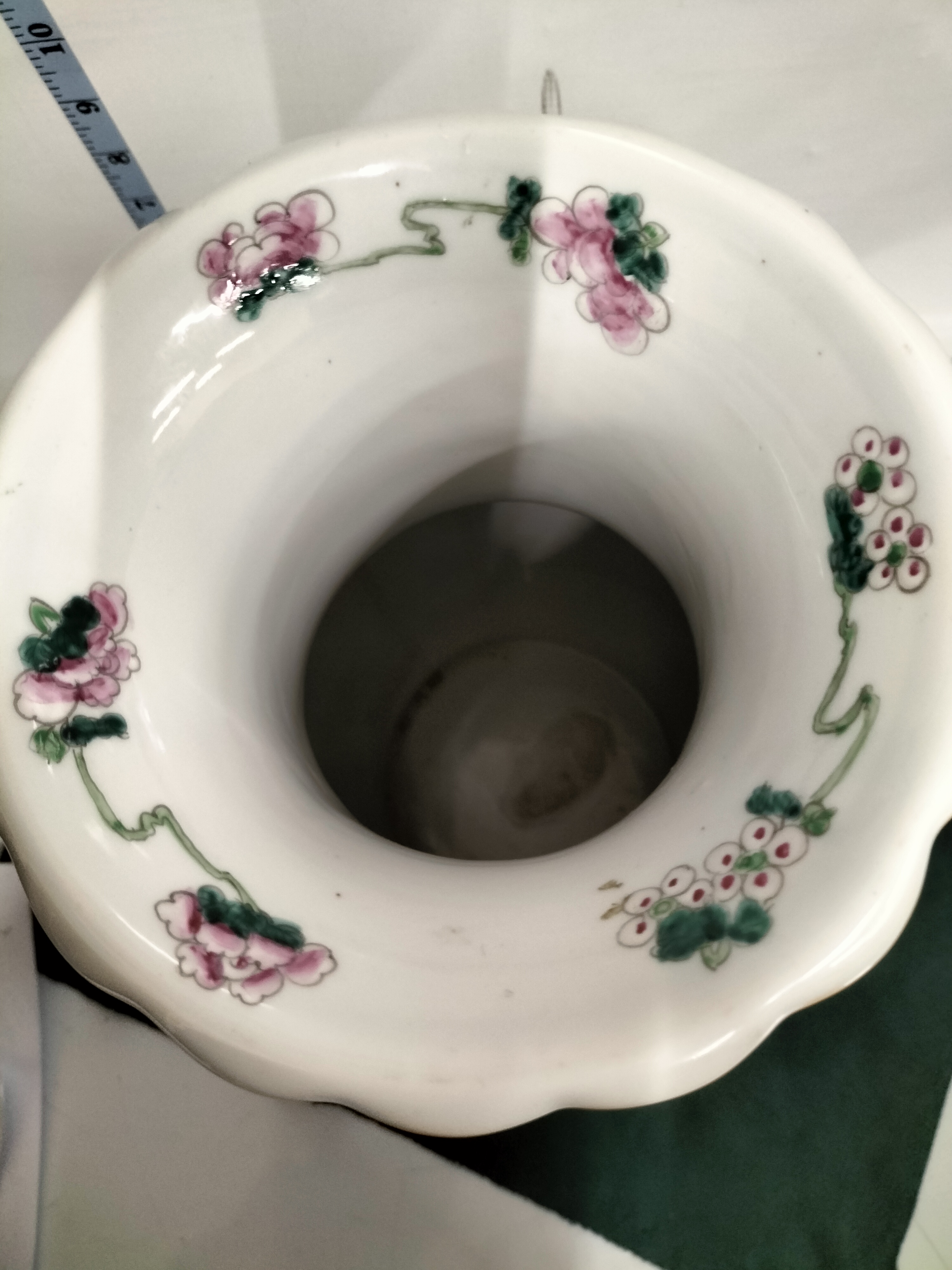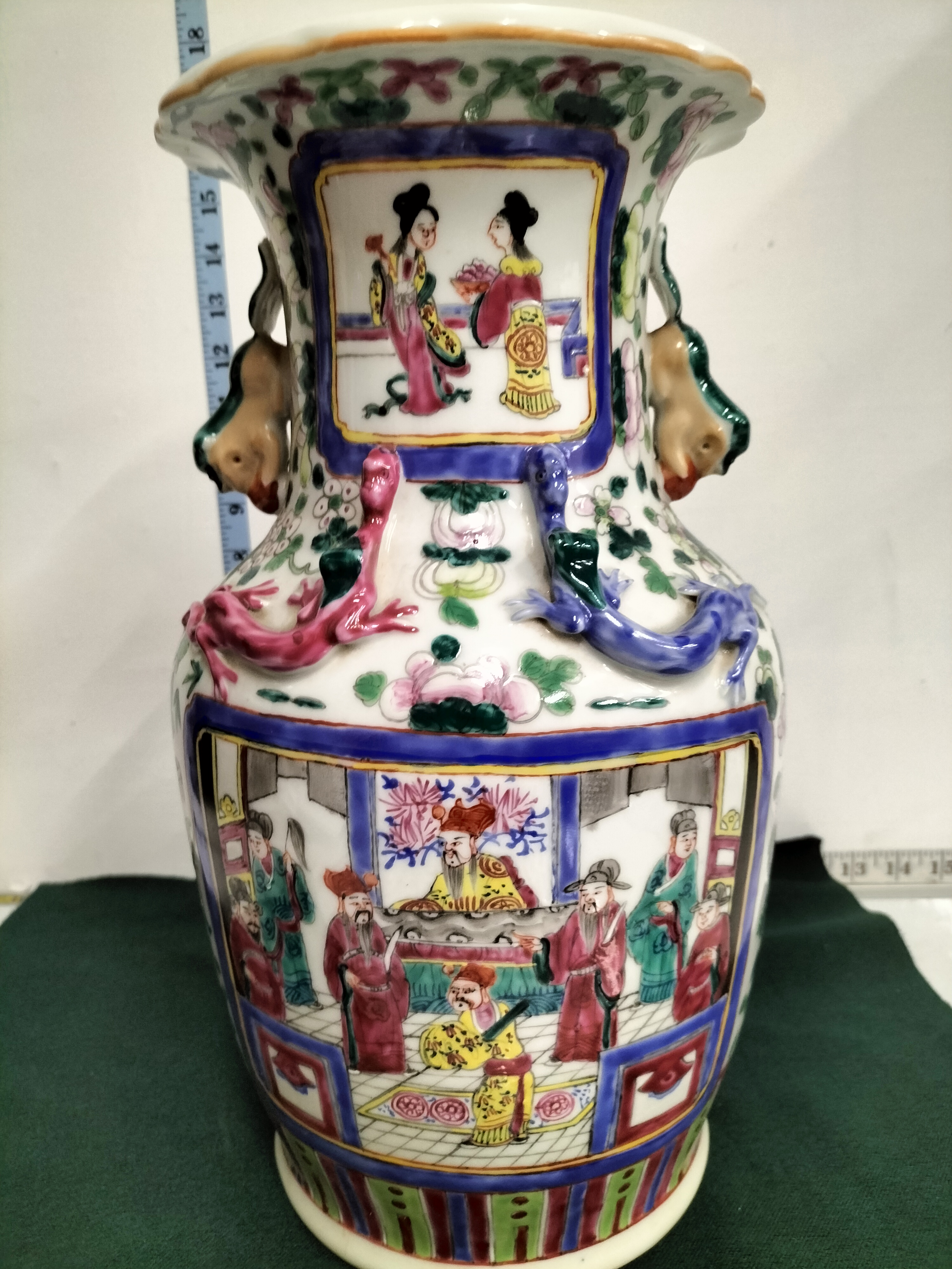 A Chinese famille rose porcelain vase decorated with panels of courtly figures and applied chilong dragons, measuring approximately 18 inches in height.