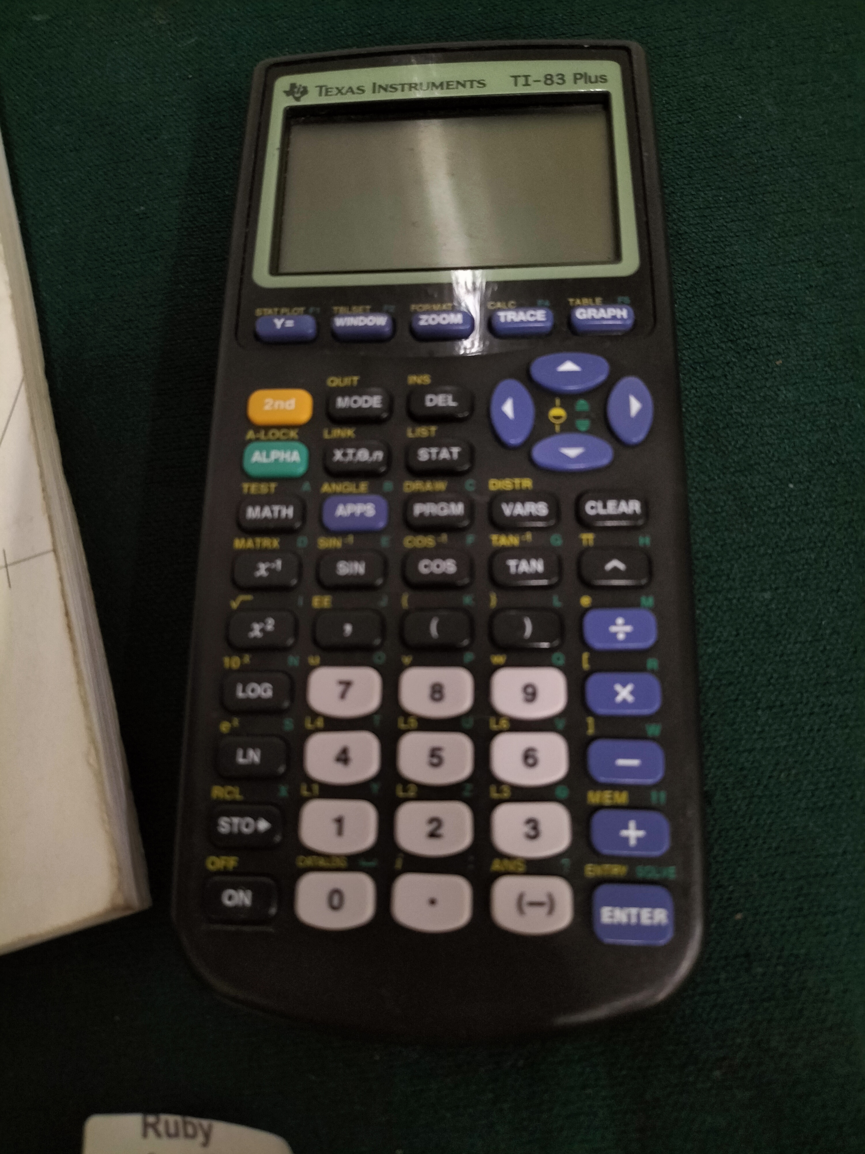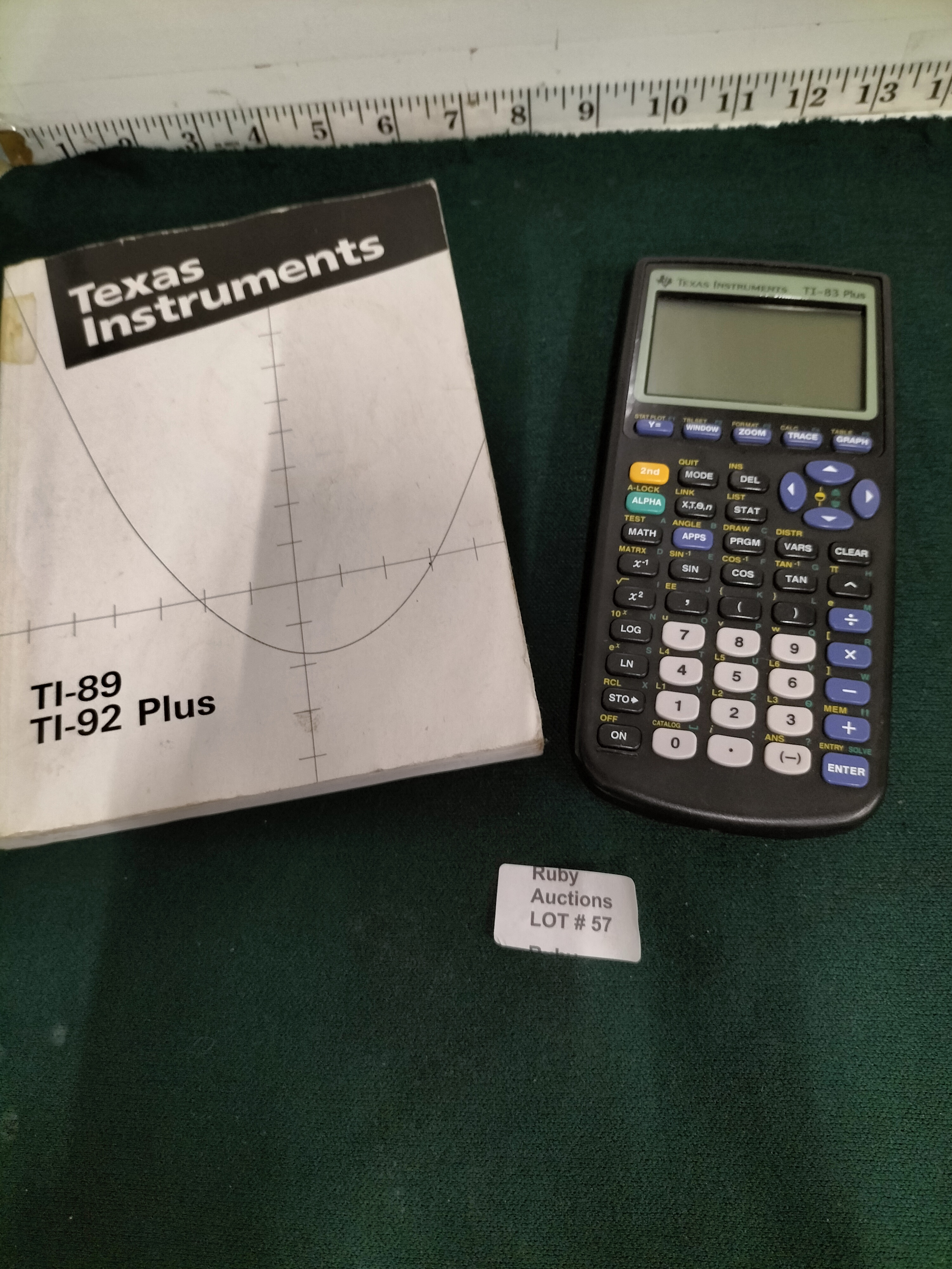A dark grey Texas Instruments TI-83 Plus graphing calculator and a white Texas Instruments TI-89 TI-92 Plus guidebook.
