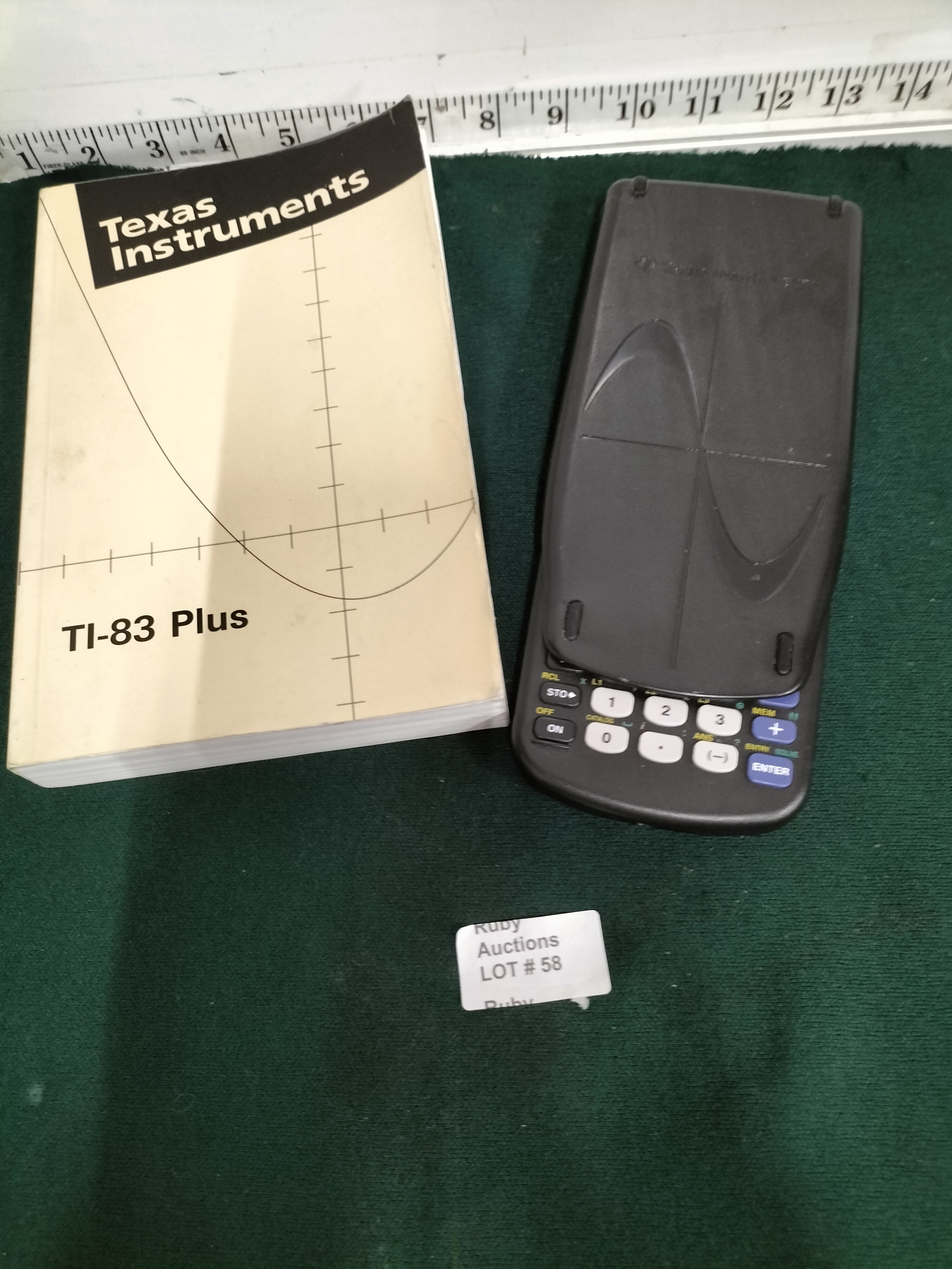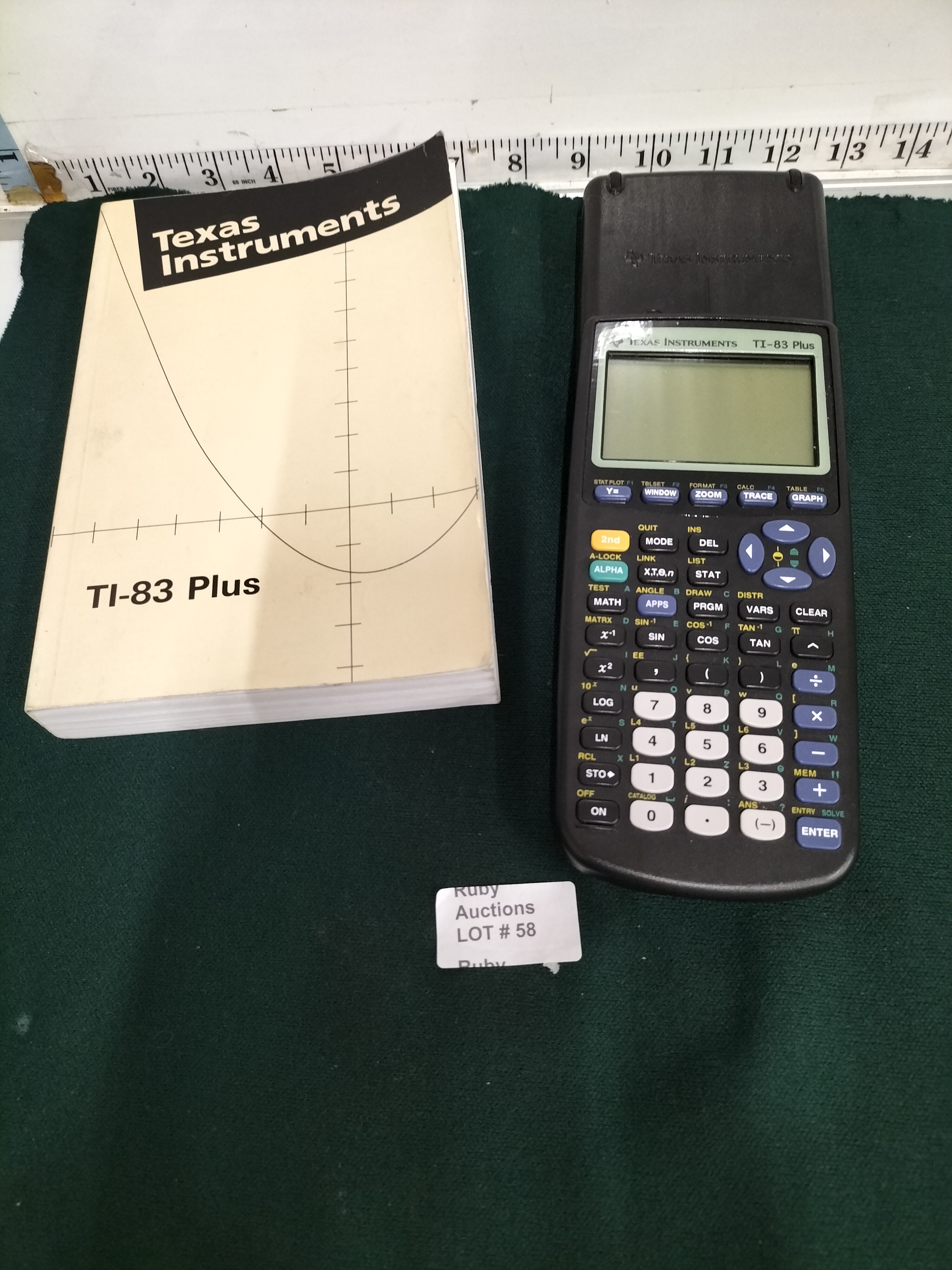 A black Texas Instruments TI-83 Plus graphing calculator and accompanying manual, the calculator measuring approximately 19cm in length.