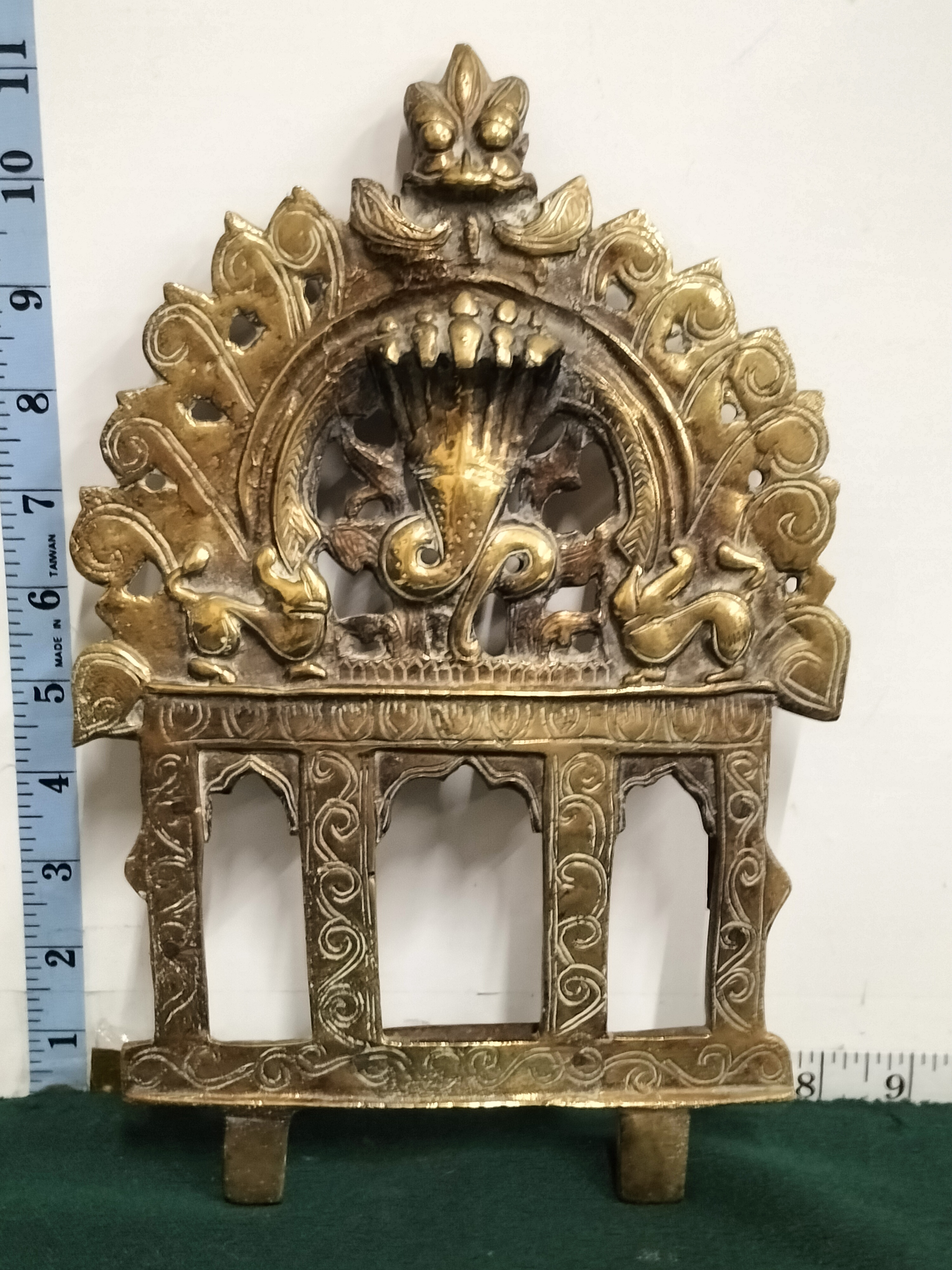An ornate Bronze prabhavali shrine backplate featuring a central Ganesha figure beneath a multi-headed cobra and Kirtimukha, measuring approximately 26.5cm in height.