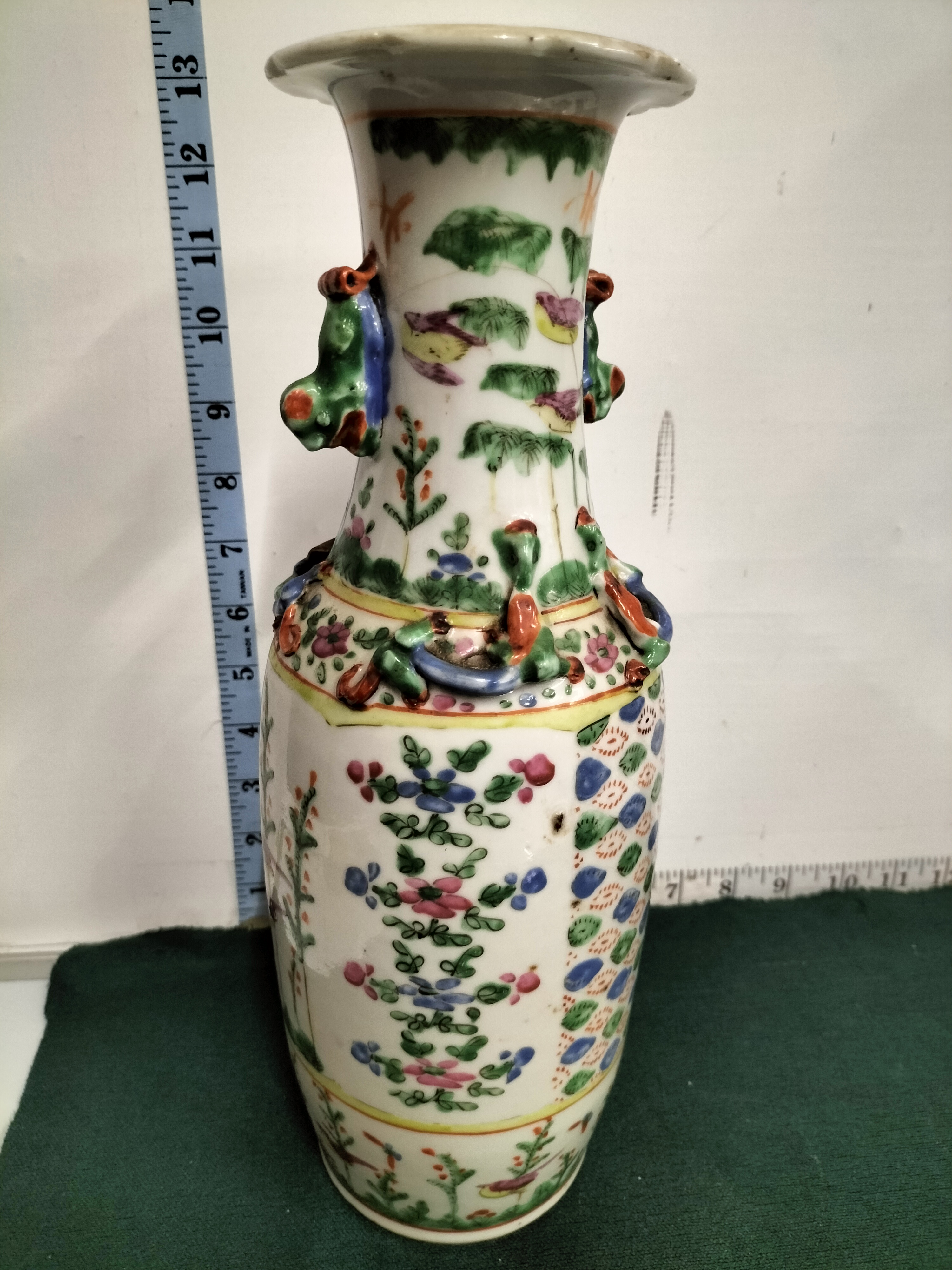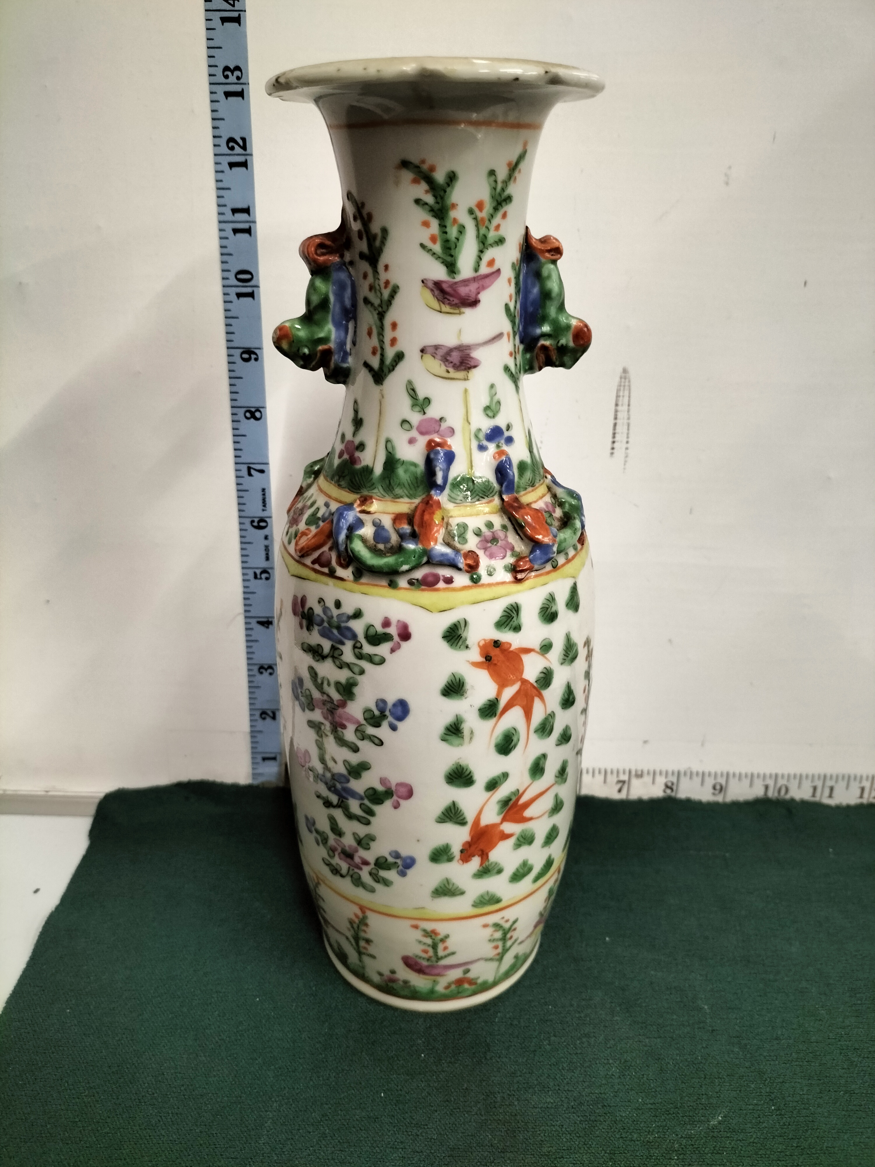 A Chinese Famille Rose vase decorated with hand-painted floral, bird, and fish motifs featuring applied handles, measuring approximately 14 inches in height.