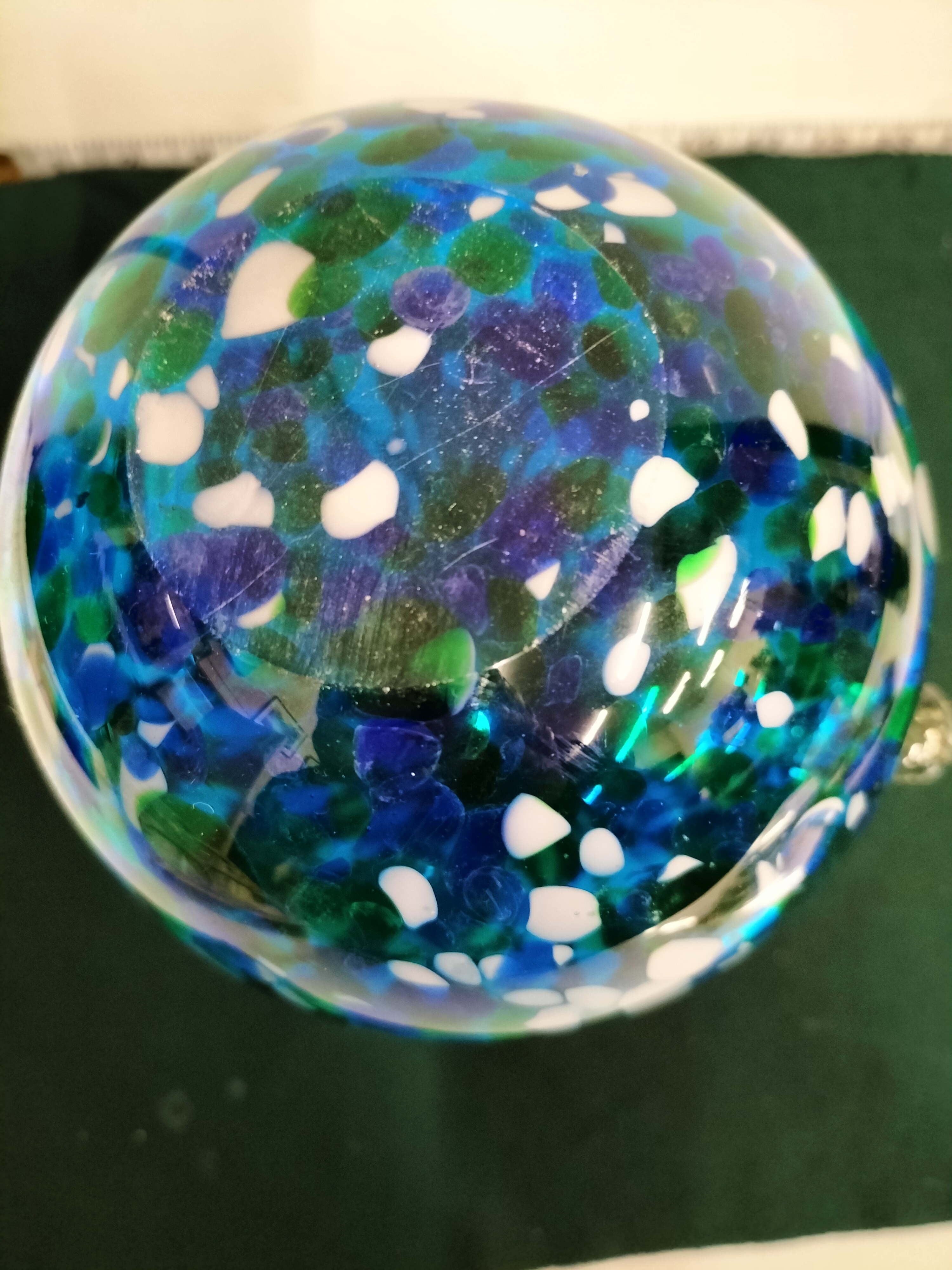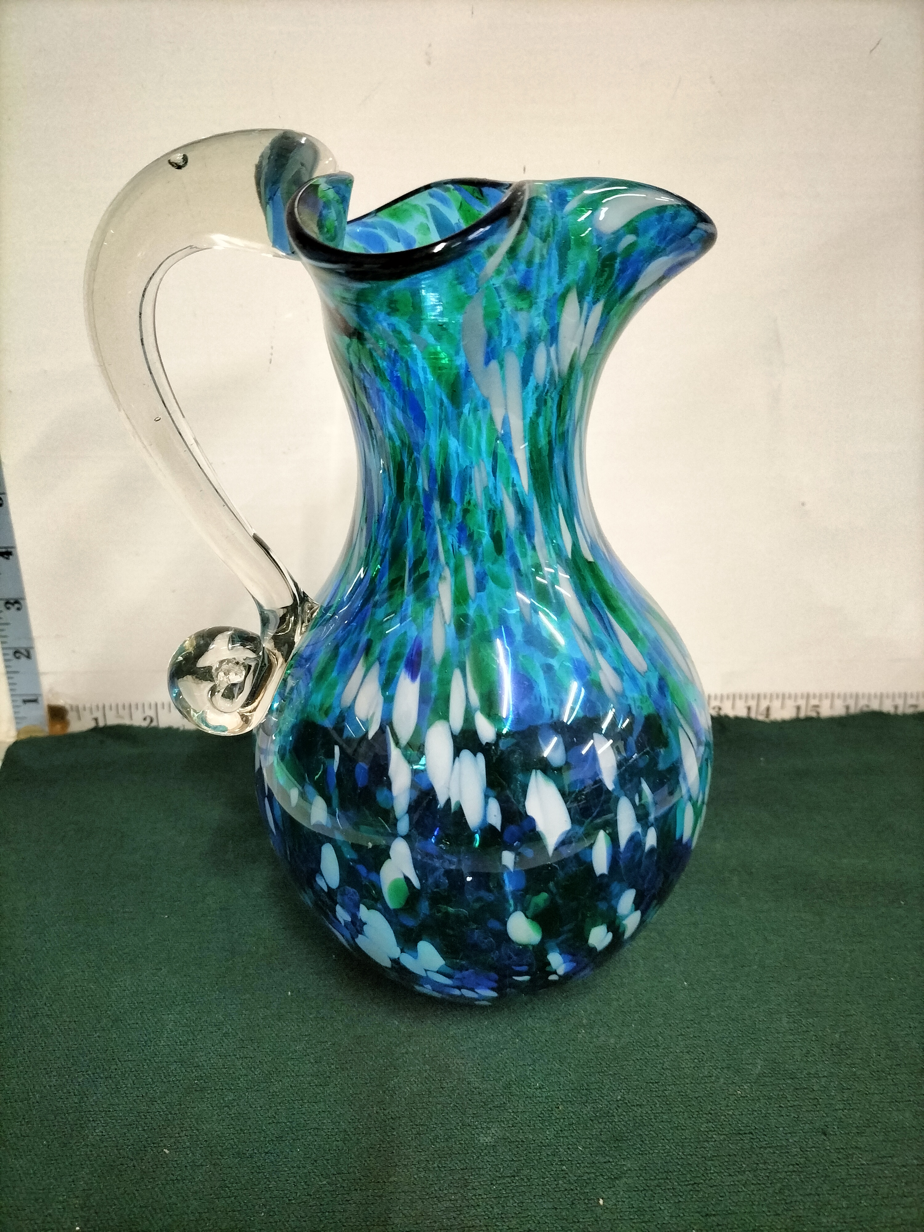 A hand-blown glass pitcher featuring a blue, green, and white mottled pattern with a clear glass handle, measuring approximately 24 cm in height.