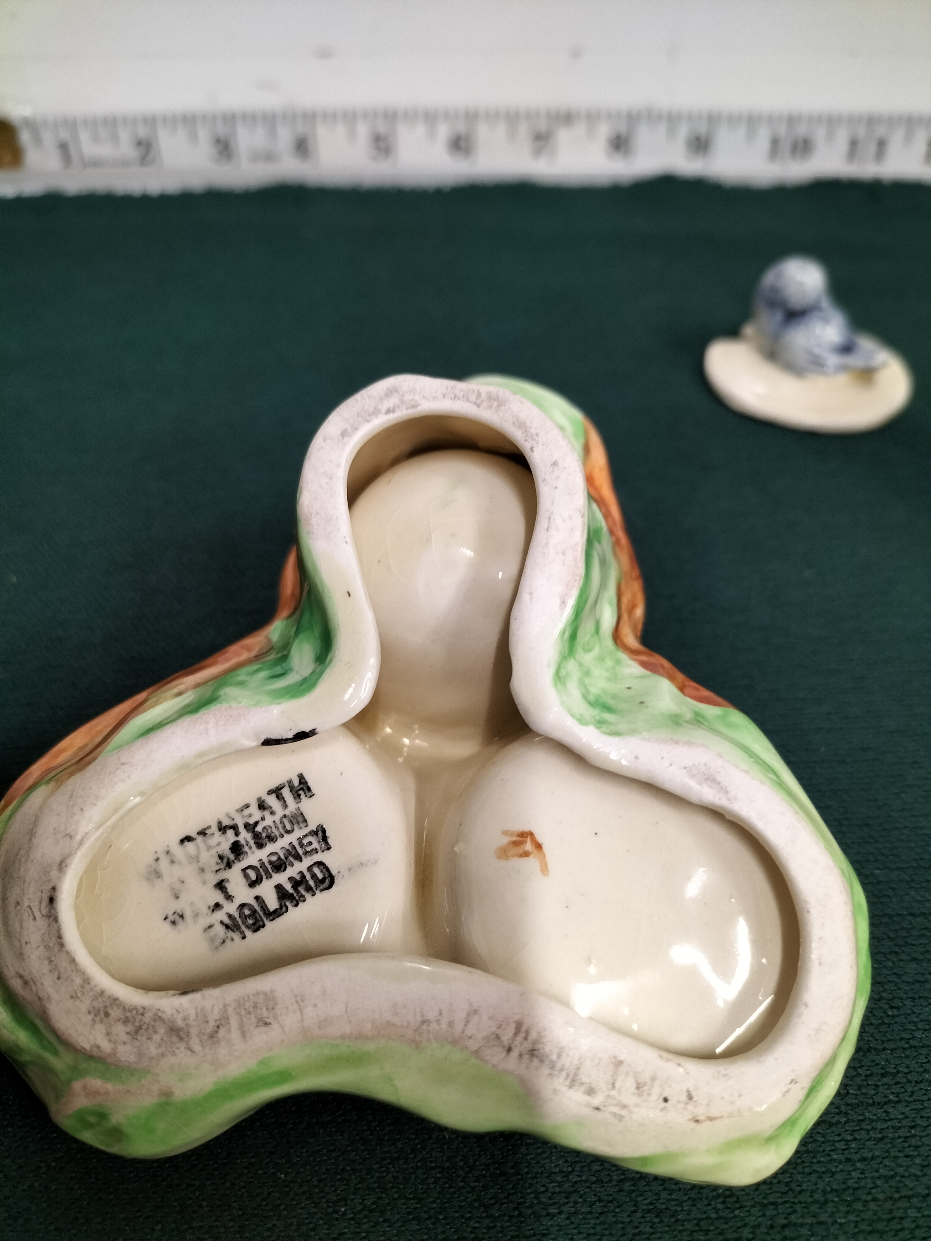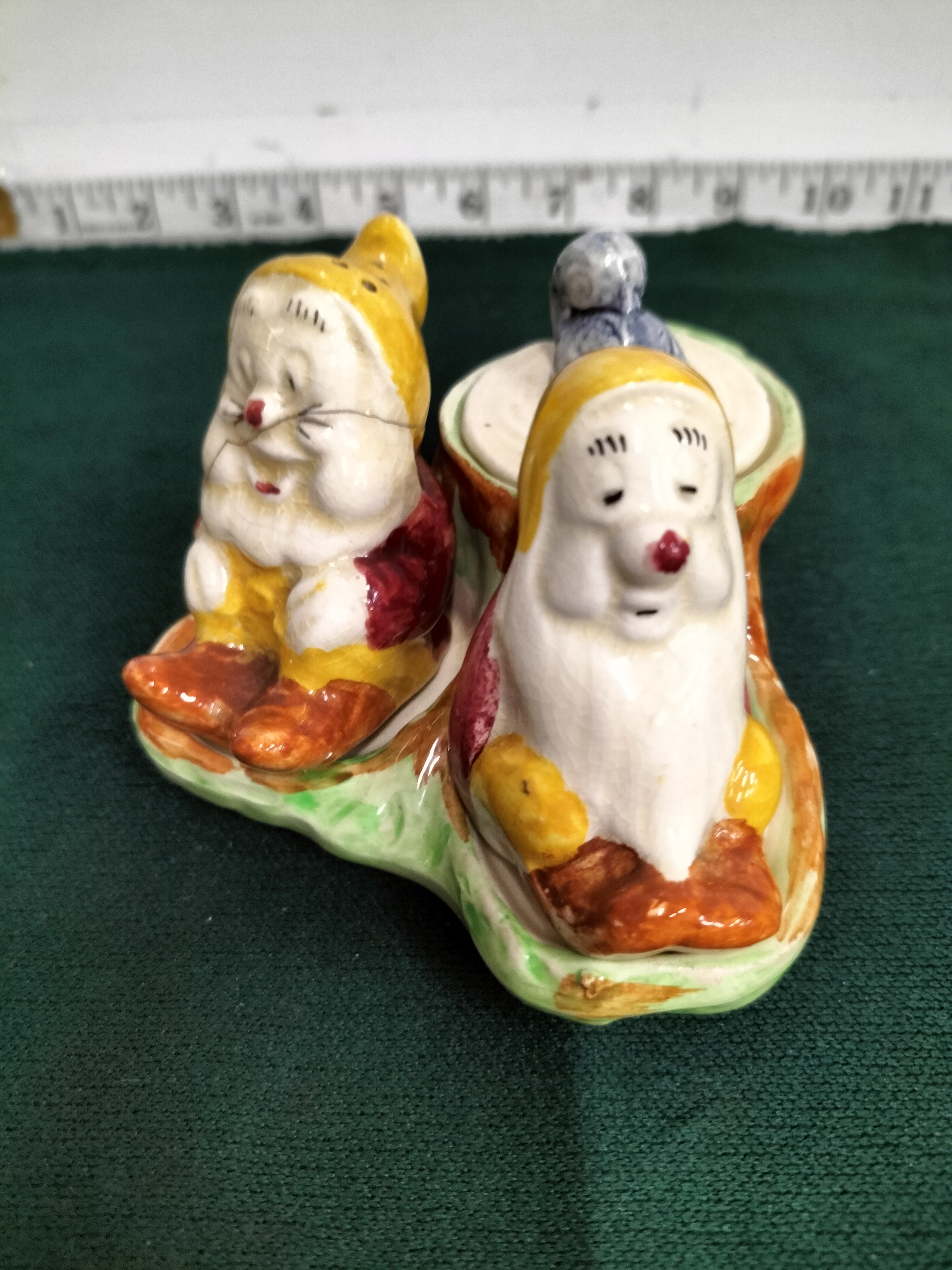 A collection of ceramic condiment set pieces featuring two dwarf figurines and a lidded pot with a blue bird finial, marked Wade Heath by permission Walt Disney England, measuring approximately 10cm in width.