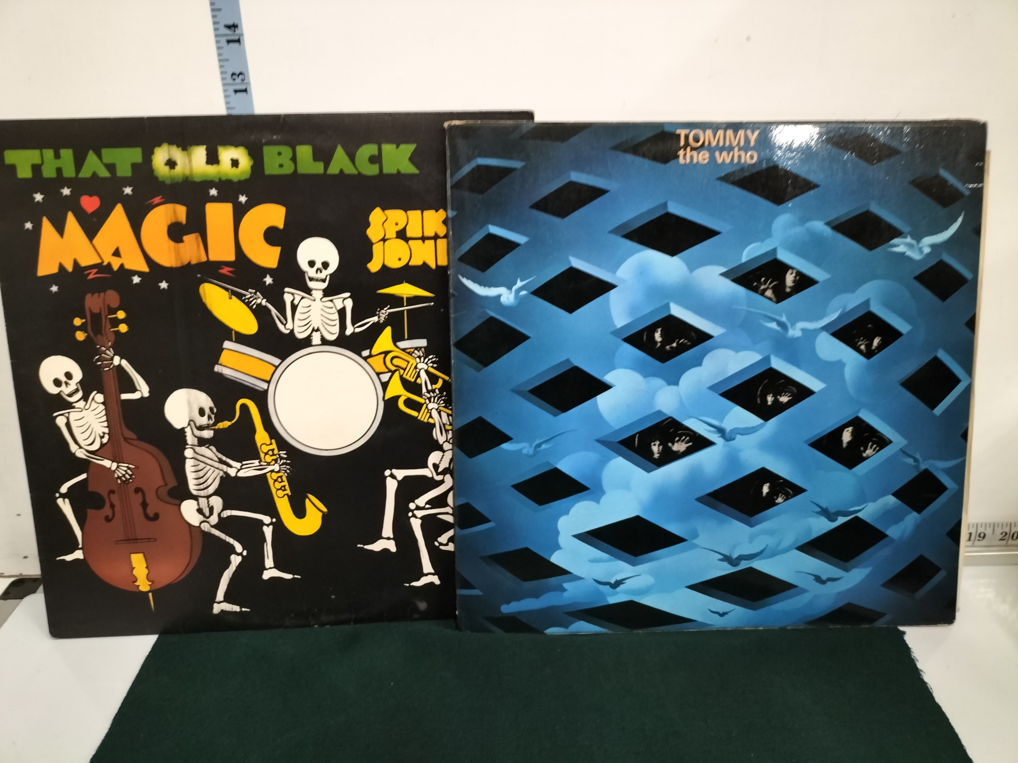 Two vinyl record albums comprising Spike Jones That Old Black Magic and The Who Tommy, each measuring approximately 31cm square.