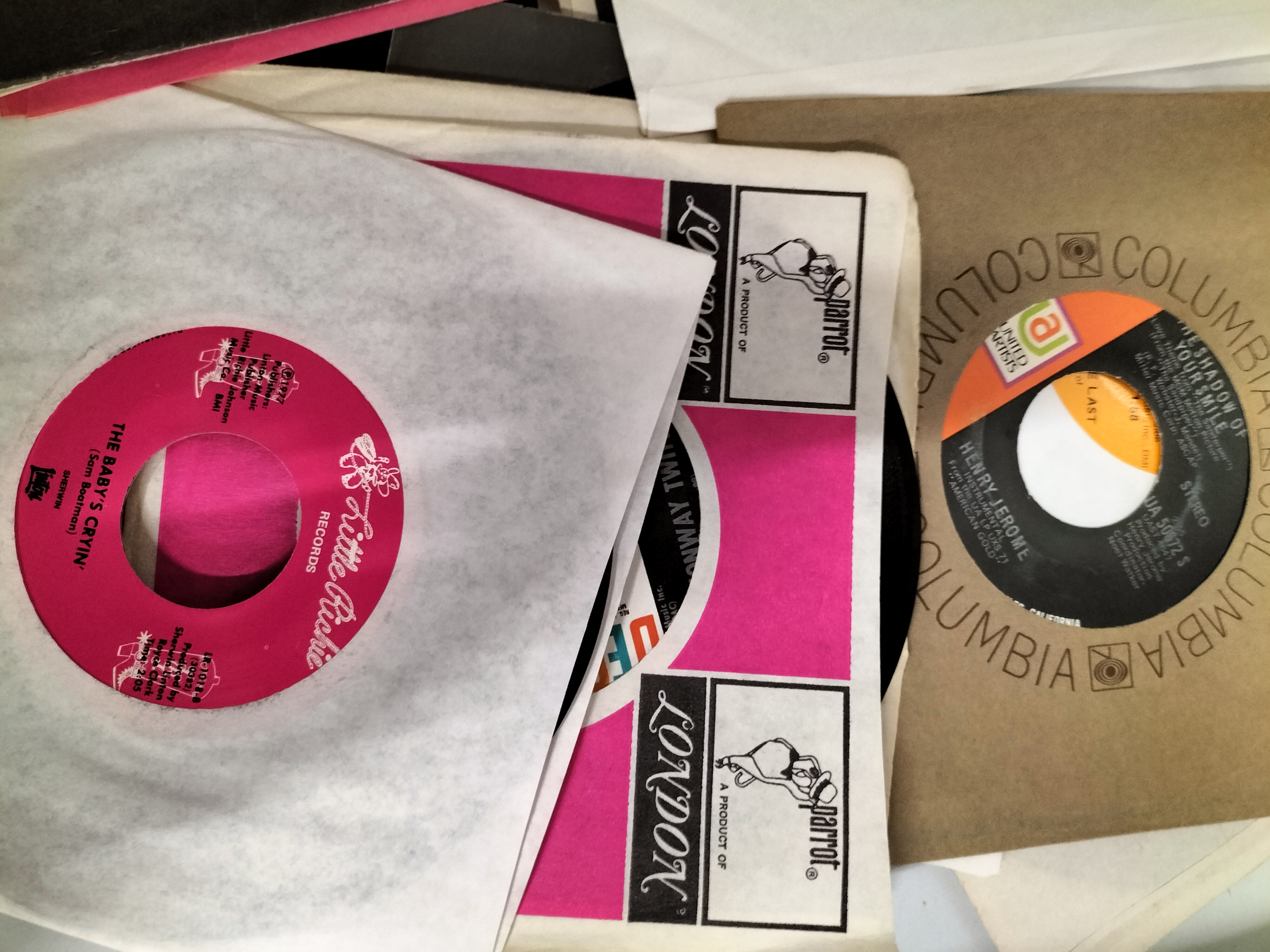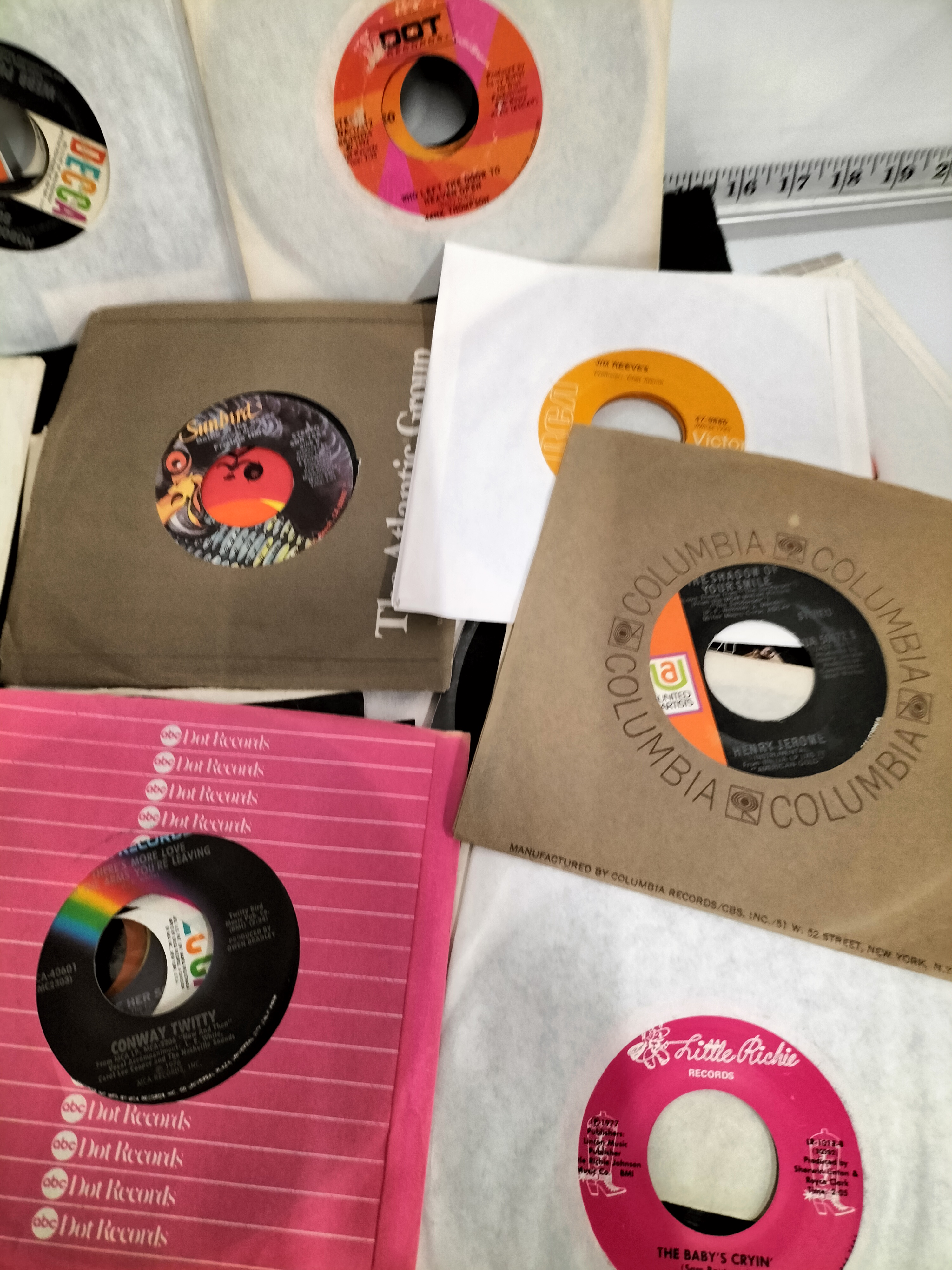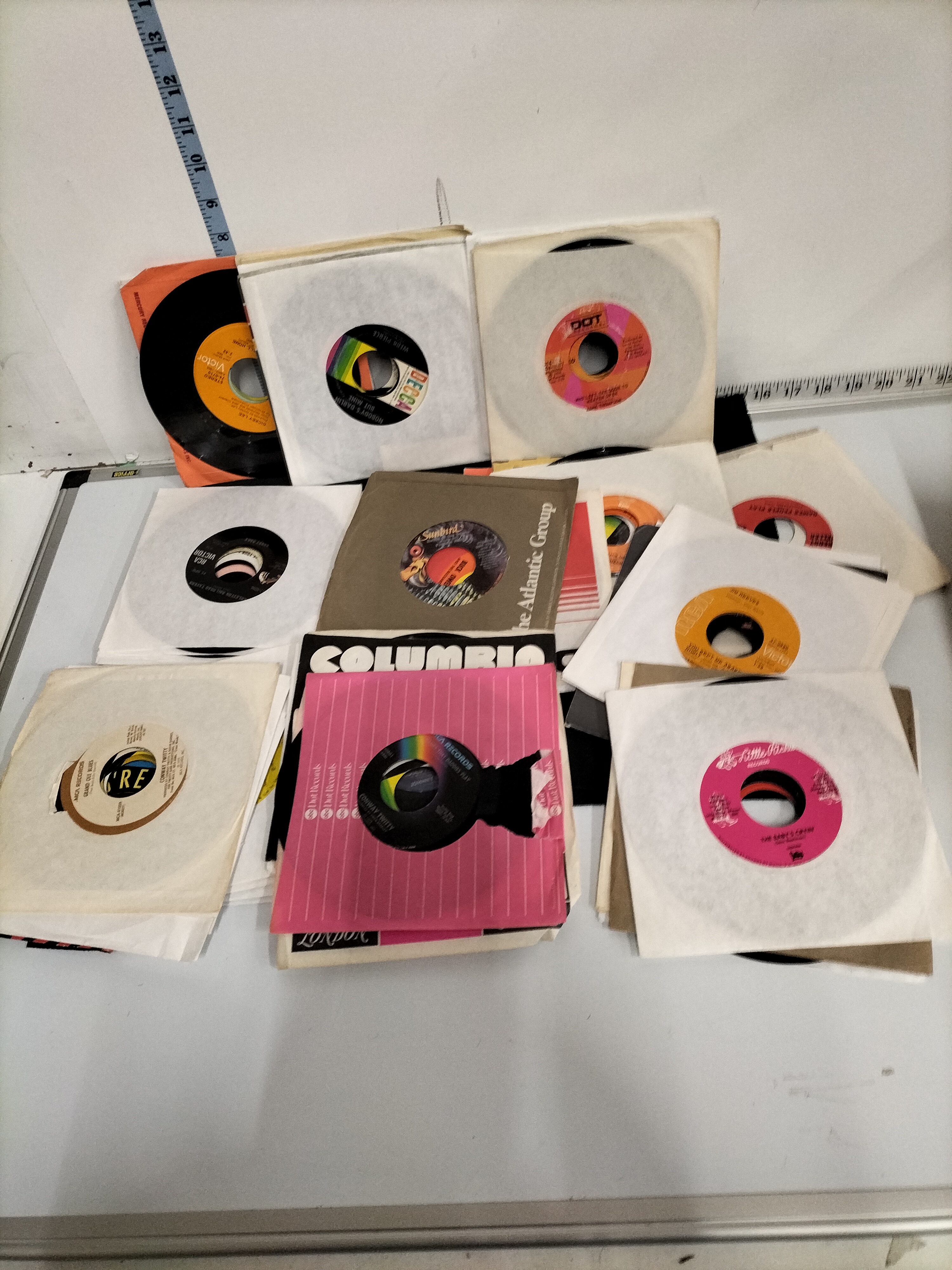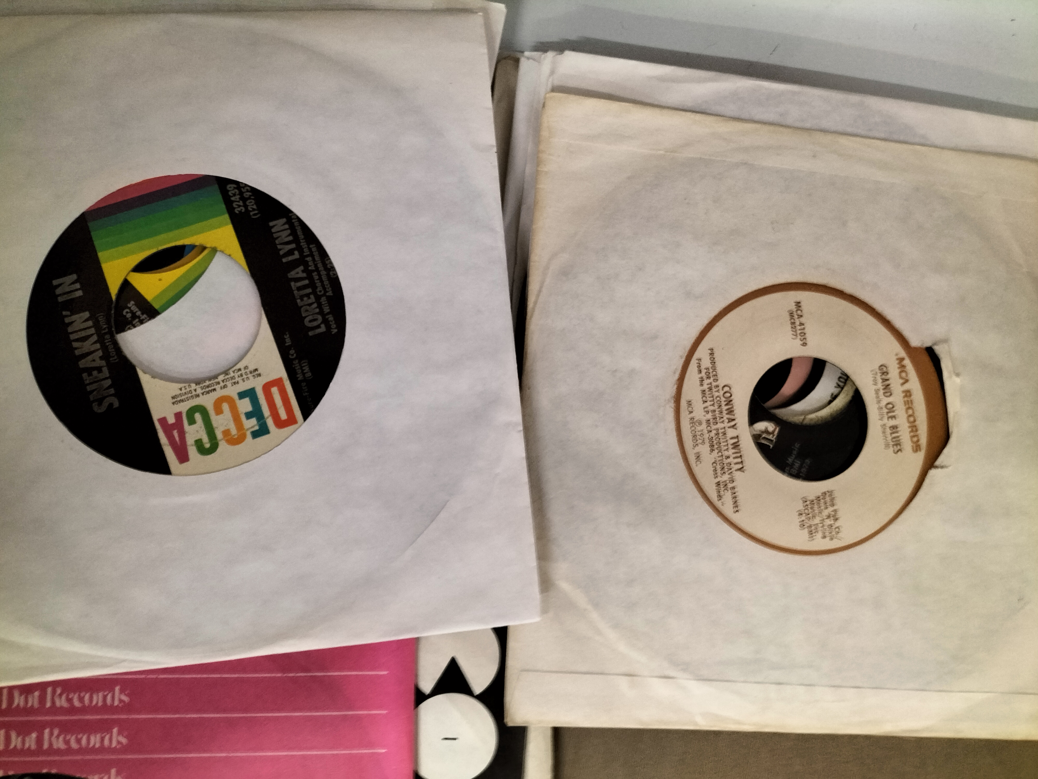A collection of 45 RPM vinyl records in various coloured sleeves featuring artists such as Loretta Lynn, Conway Twitty, and Jim Reeves across labels including Decca, MCA, and RCA Victor.