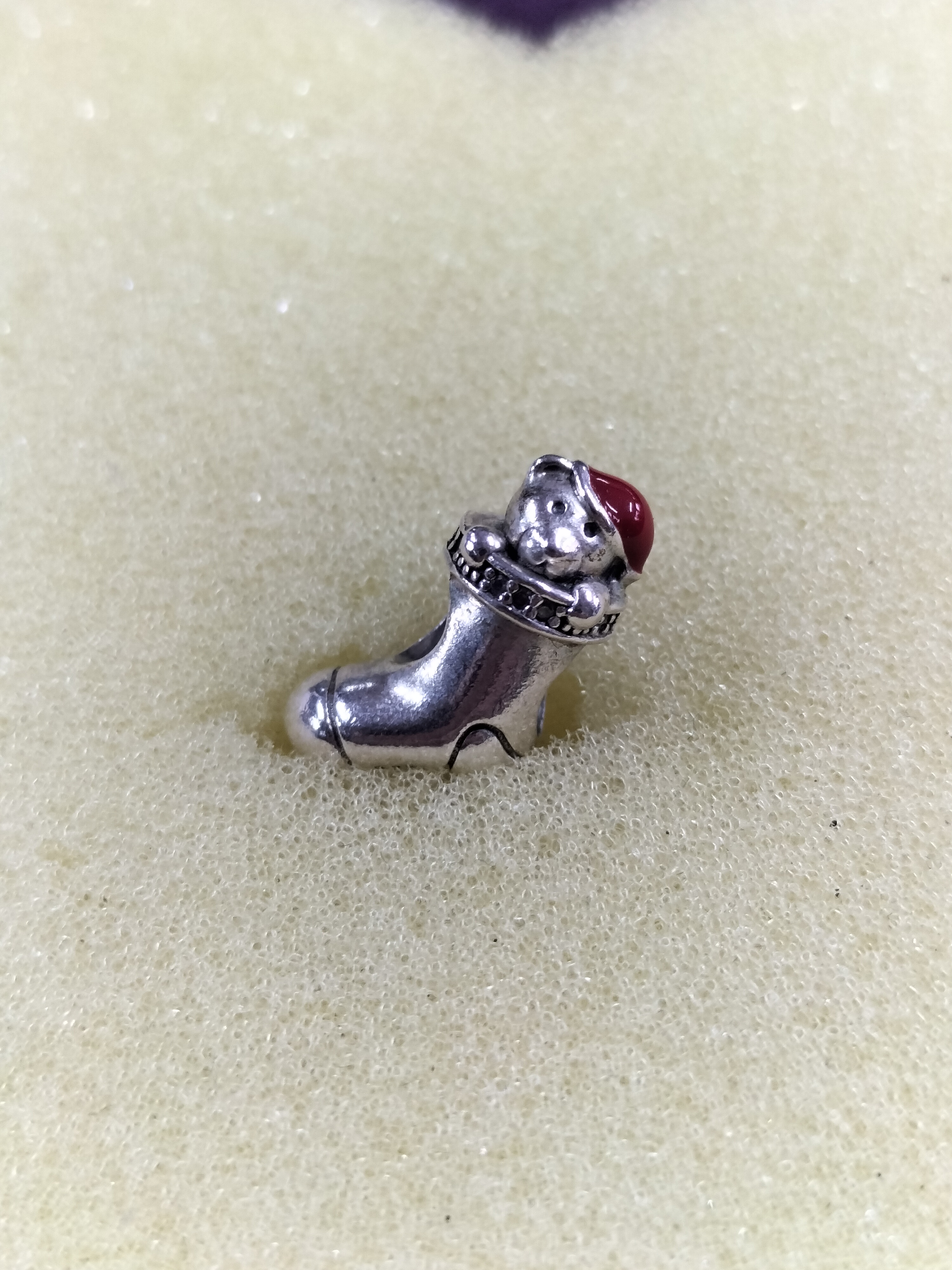 A silver jewellery charm featuring a Christmas stocking with a teddy bear wearing a red enamel hat.