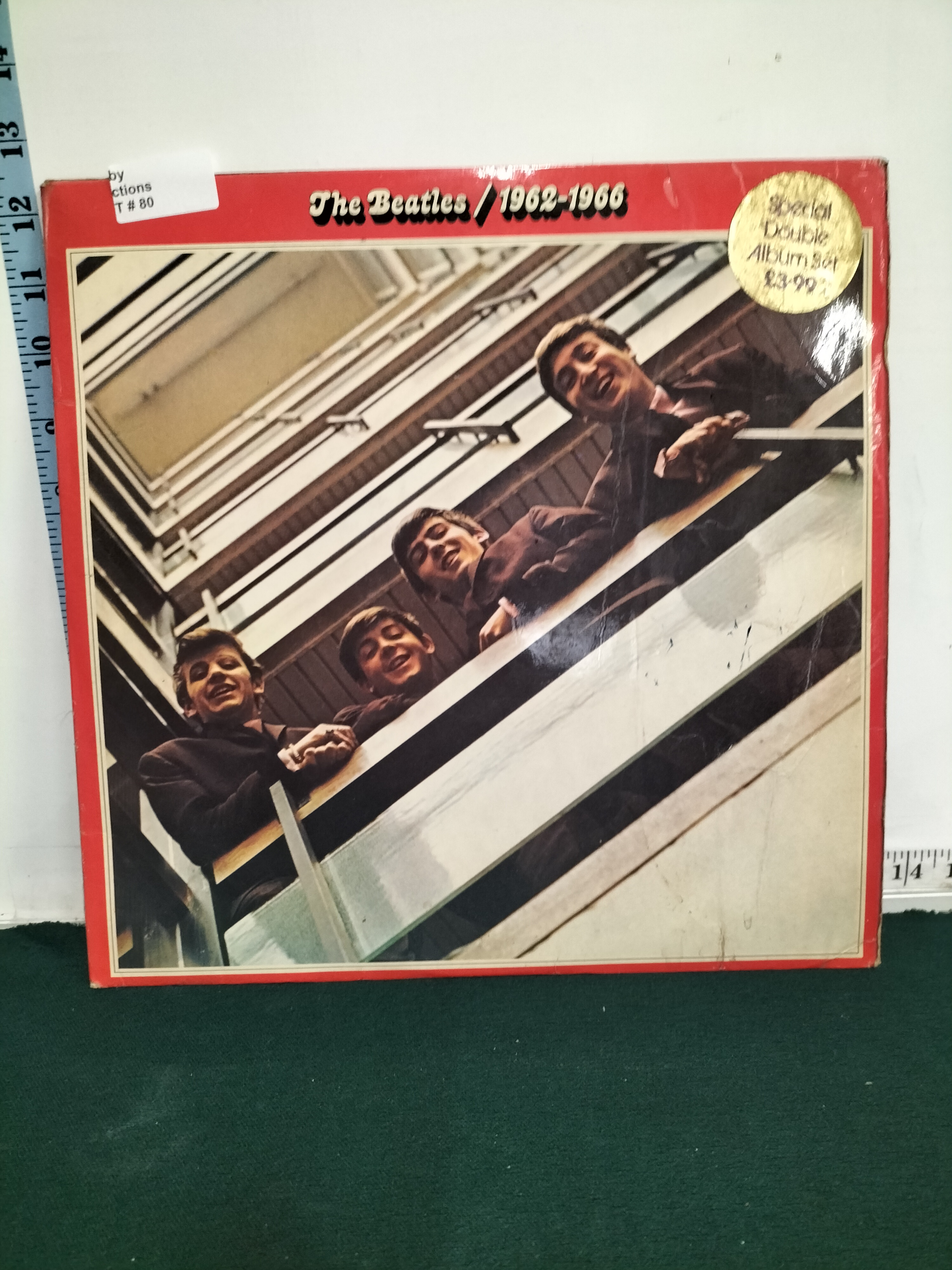 A double vinyl record album titled The Beatles / 1962-1966 featuring a red gatefold sleeve with a gold price sticker, measuring approximately 31cm square.