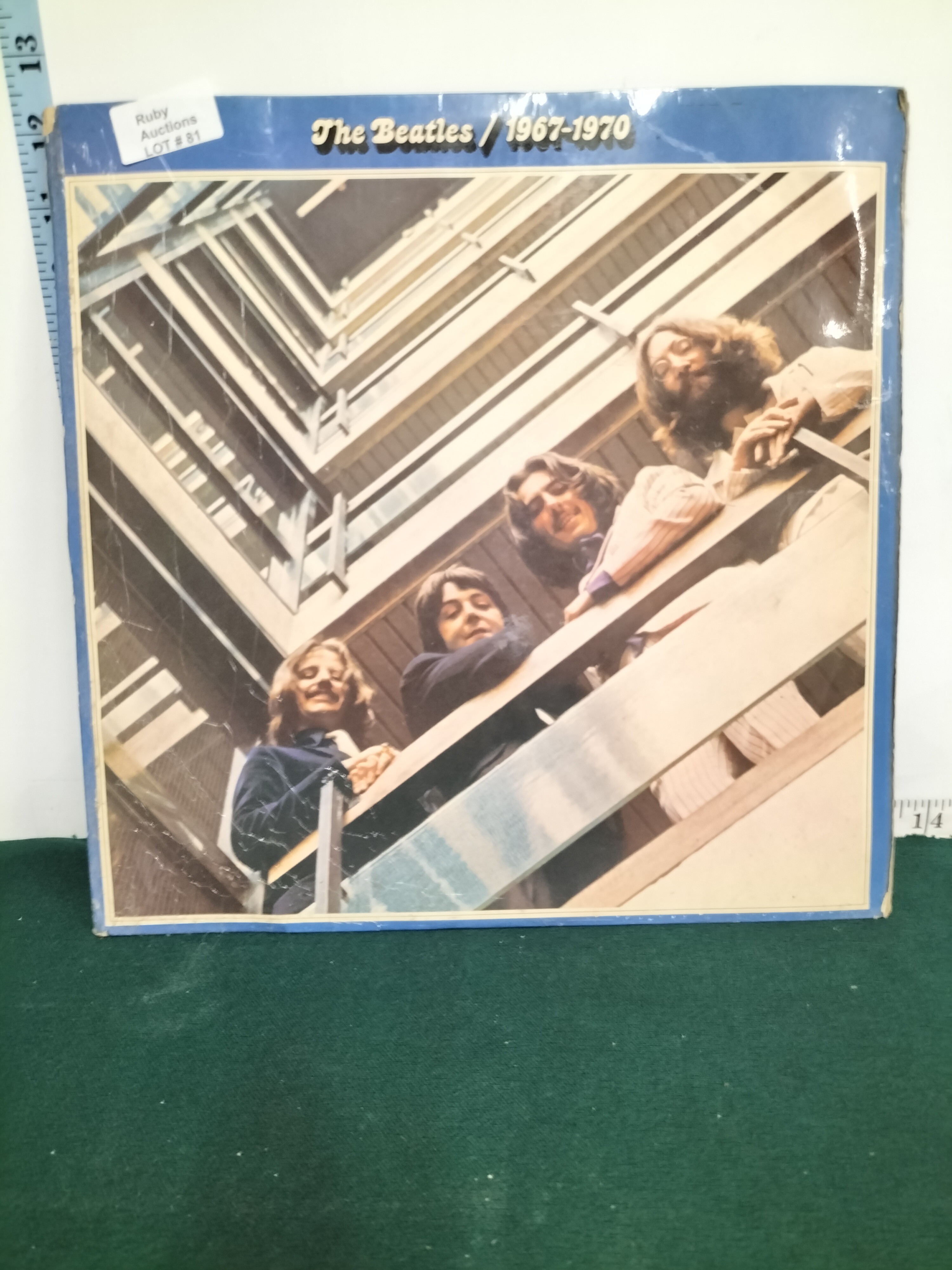 The Beatles 1967-1970 vinyl record album featuring a blue border and band photograph on the cover, measuring approximately 12 inches square.