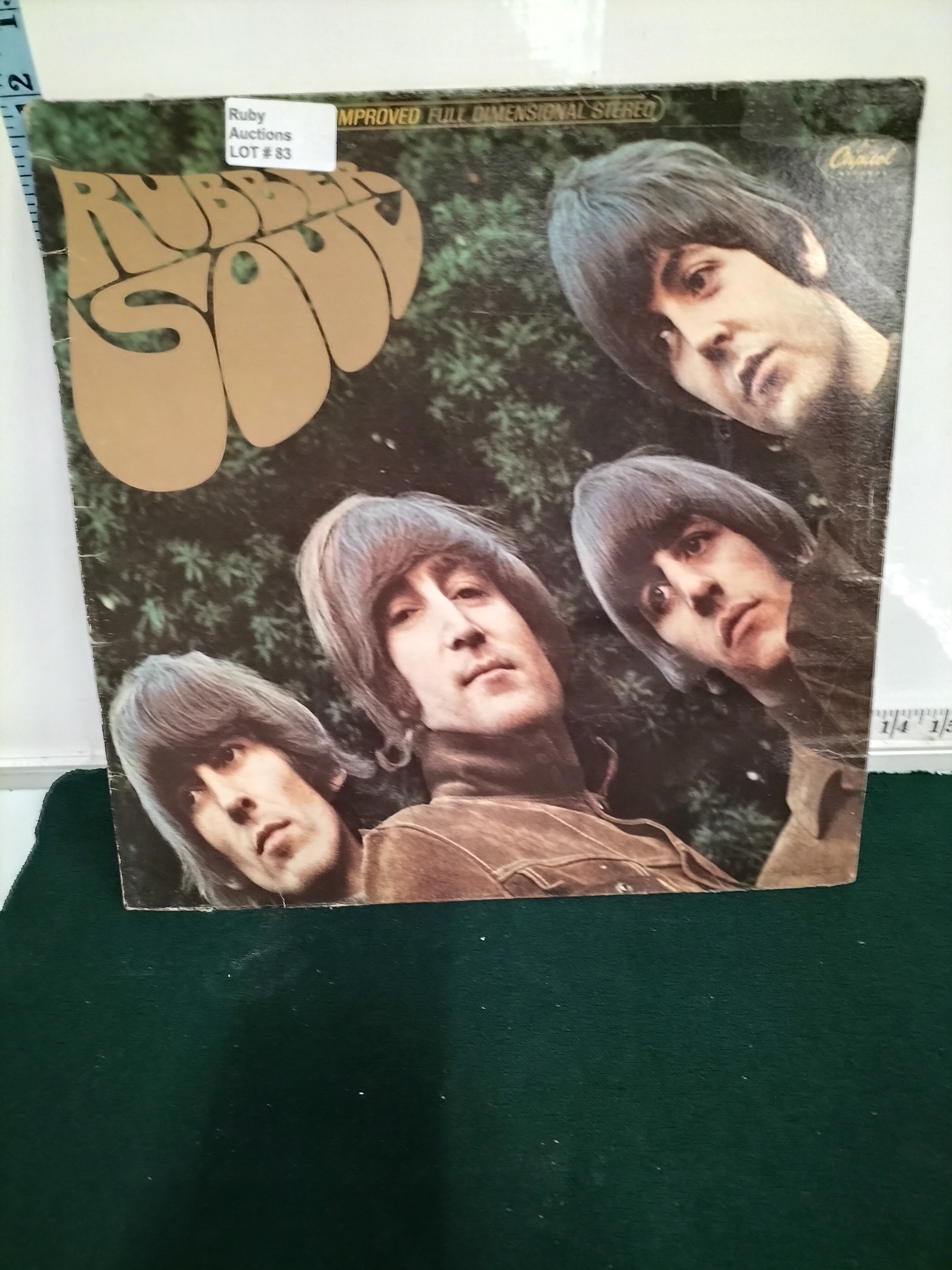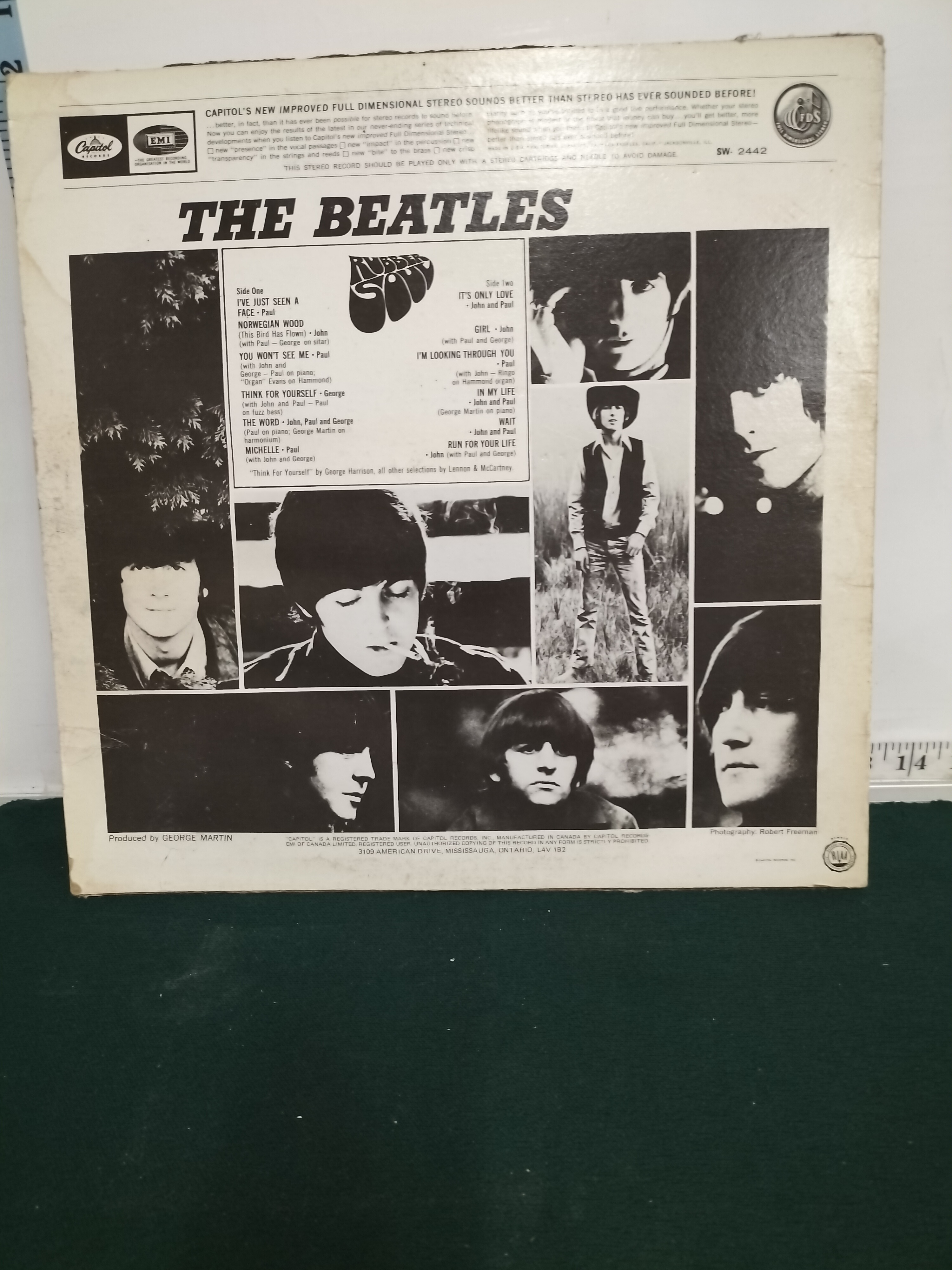 A multicoloured vinyl record album titled Rubber Soul by The Beatles, manufactured in Canada by Capitol Records-EMI, measuring approximately 12 inches square.