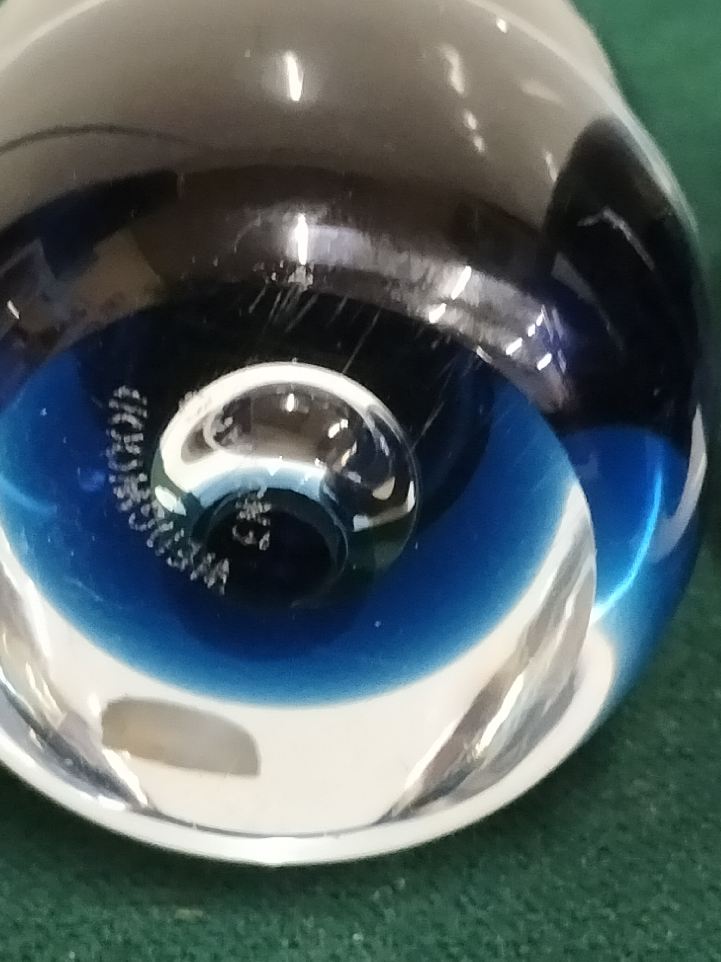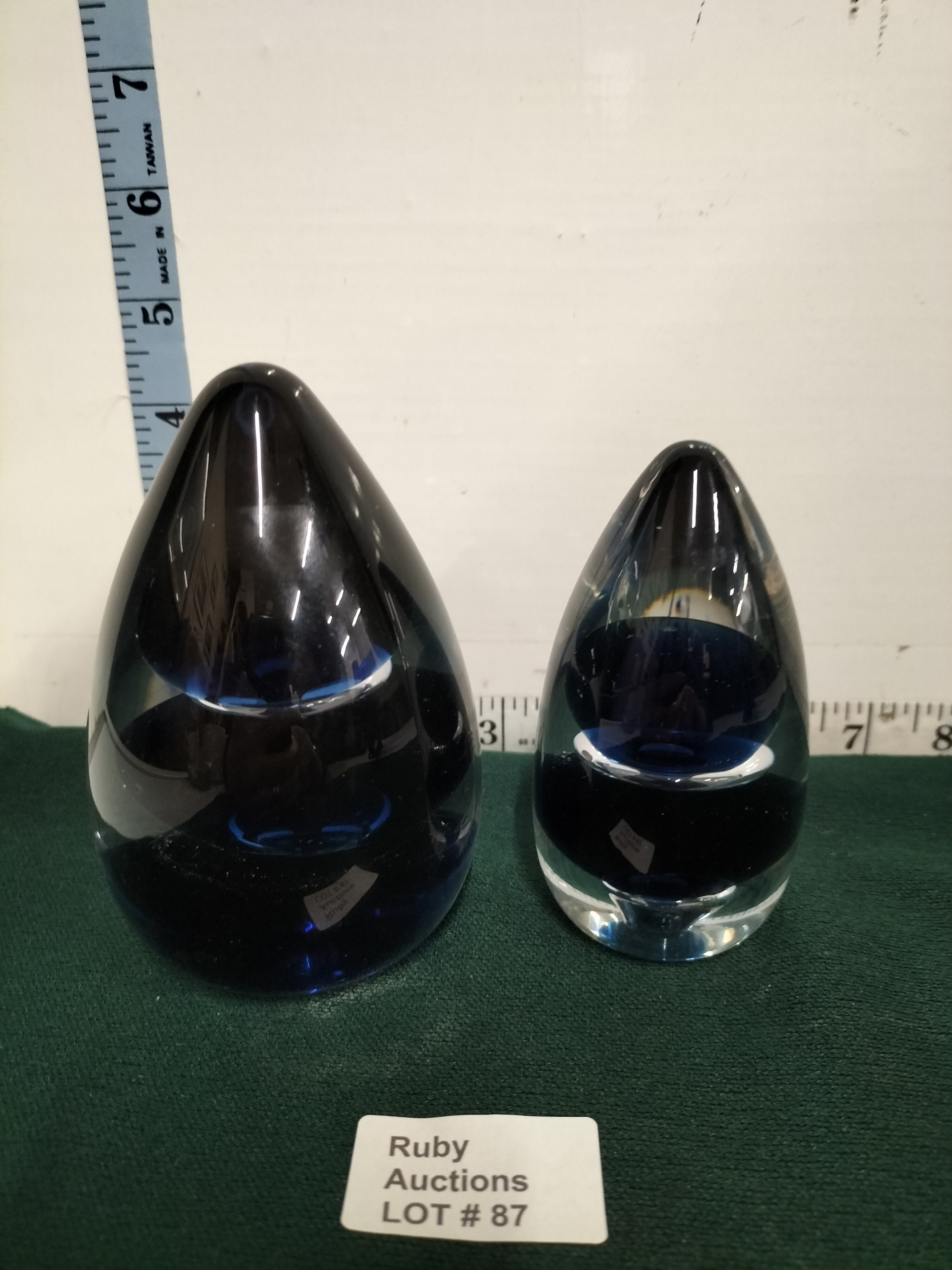 A pair of teardrop-shaped cobalt blue and clear glass paperweights with etched Wedgwood England maker marks to the bases, measuring approximately 4 to 5 inches in height.
