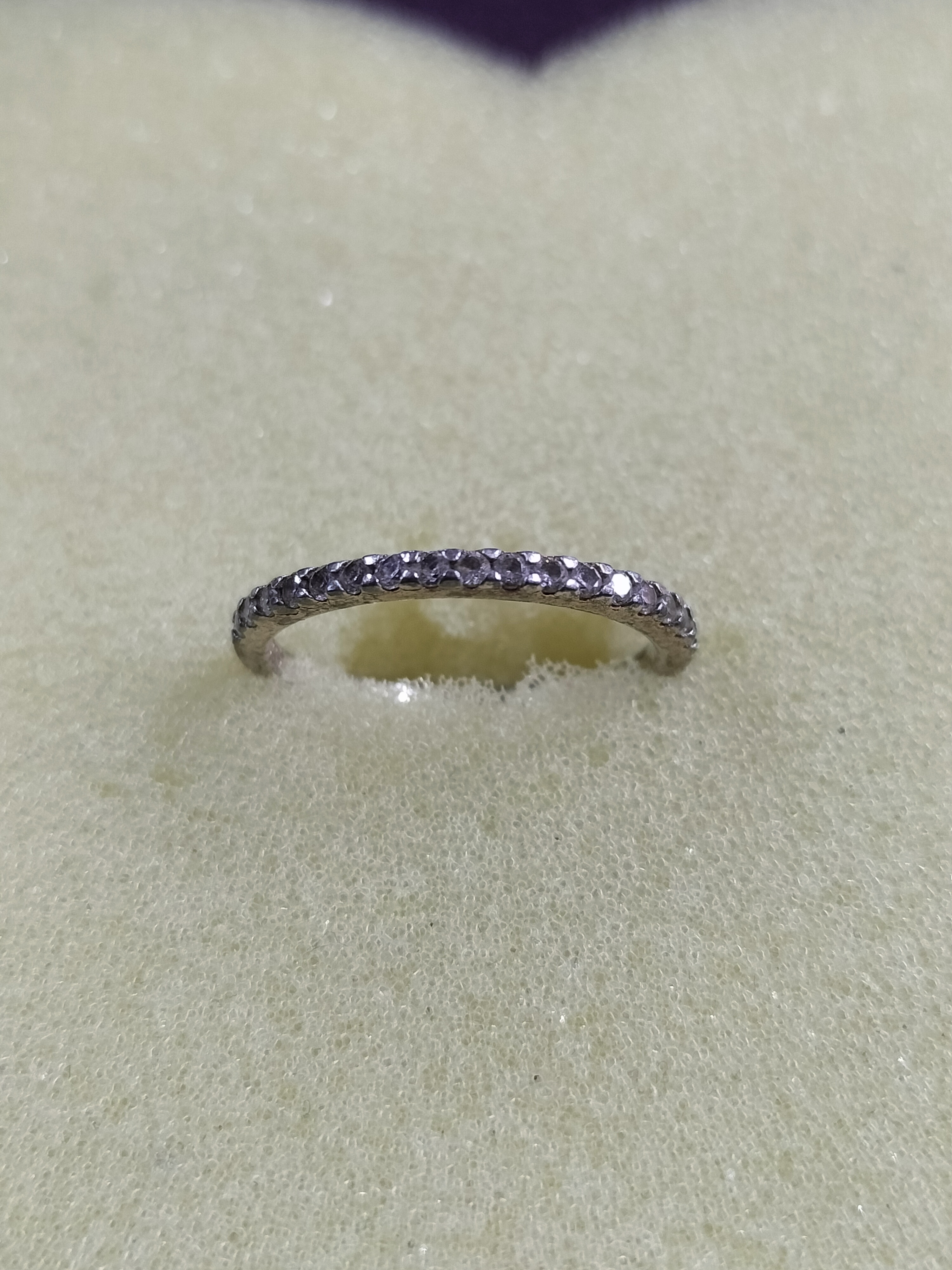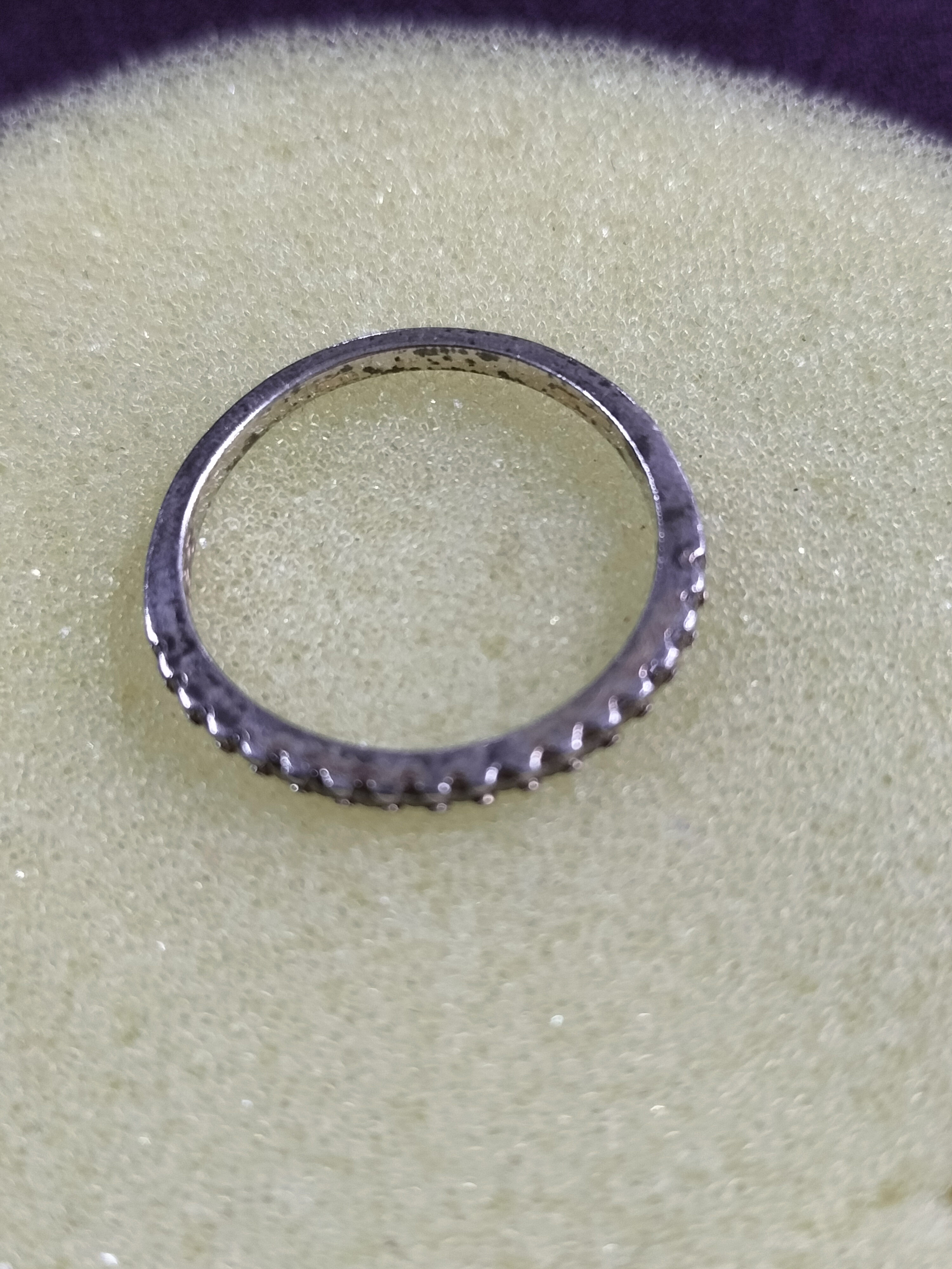 A single silver band ring featuring a row of multiple small clear stones in a shared prong setting.