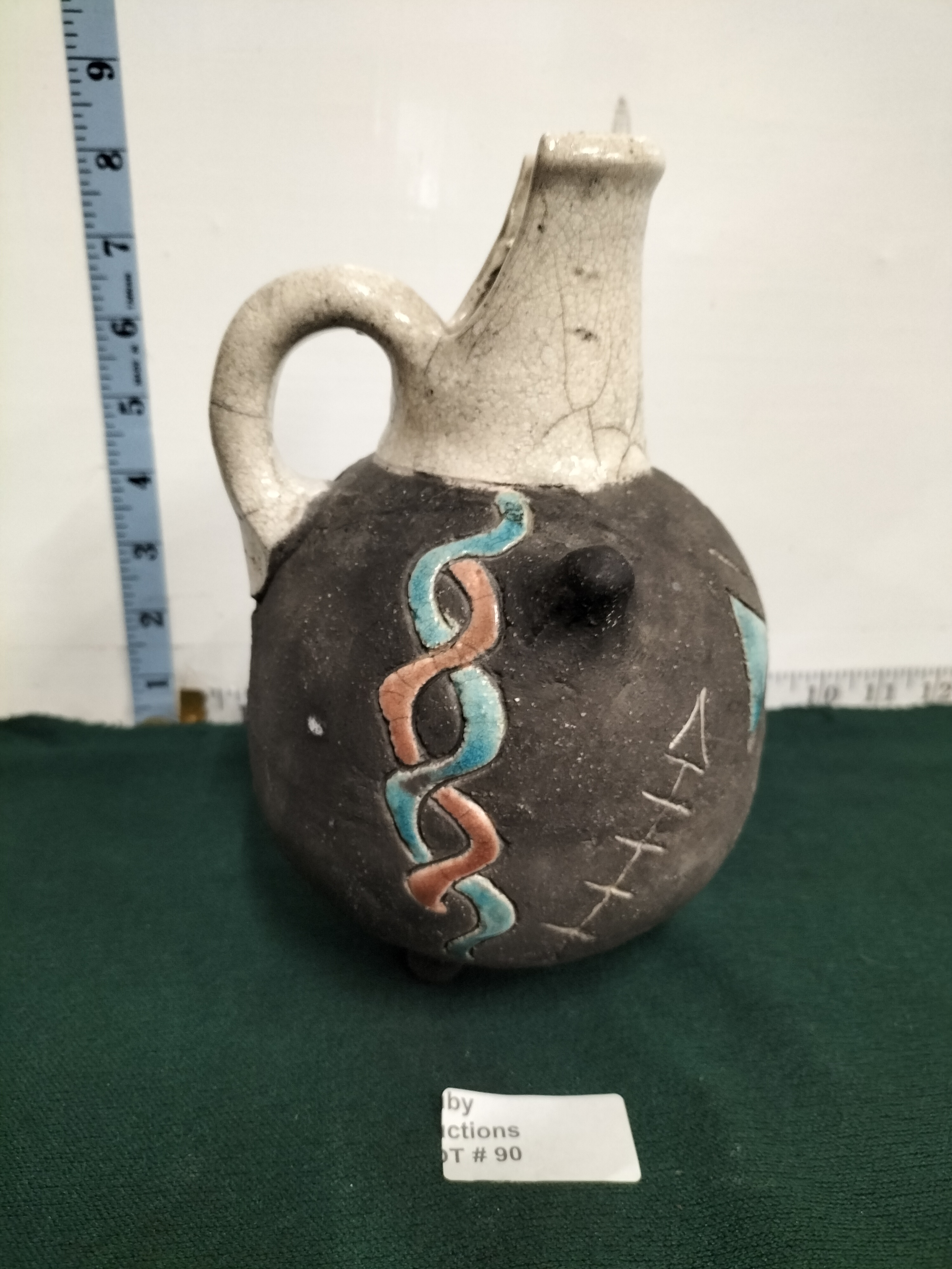 A ceramic tripod pitcher with a dark grey textured body, white crackle-glazed neck, and abstract blue and salmon-coloured patterns, measuring approximately 8.5 inches in height.