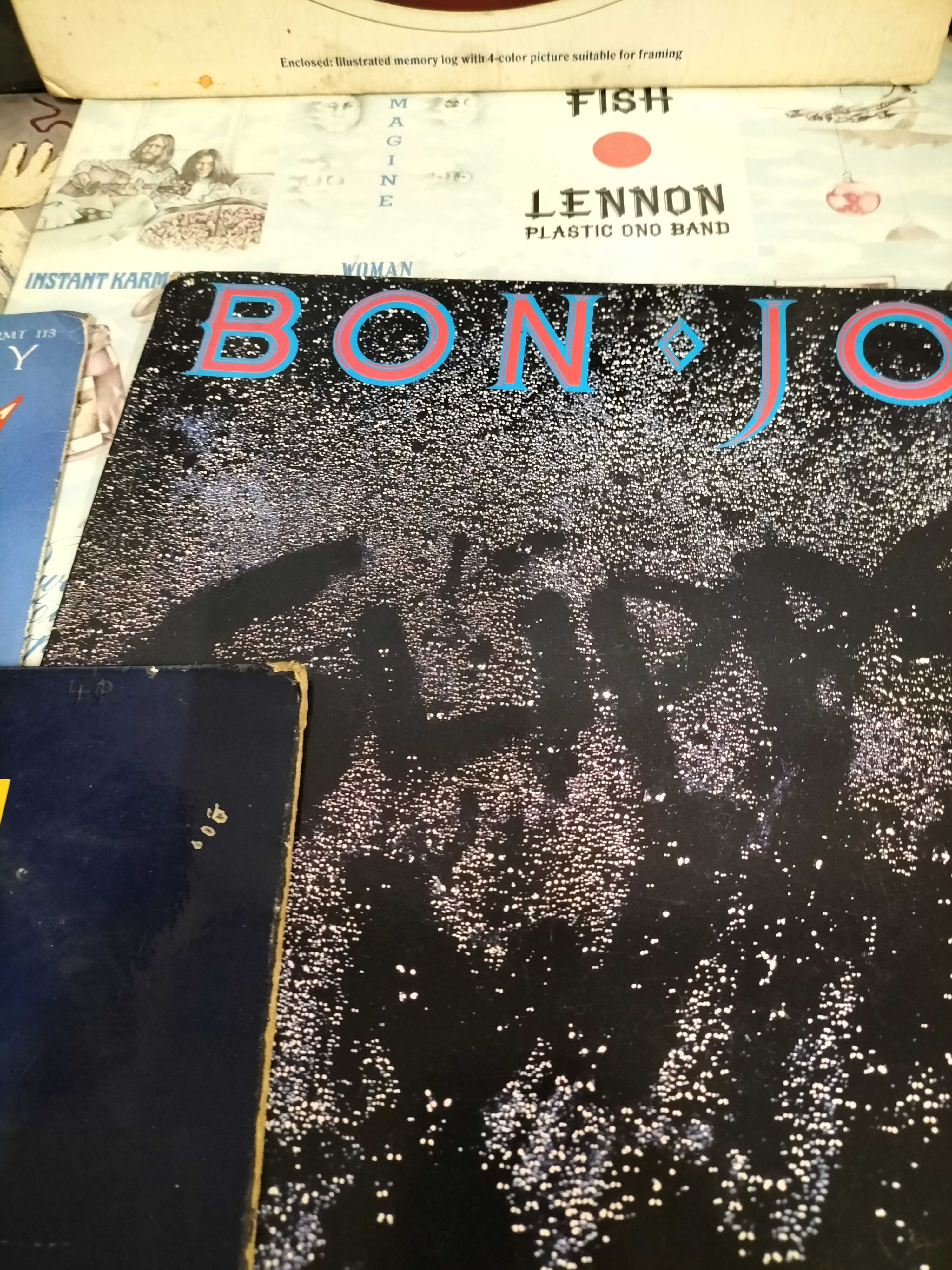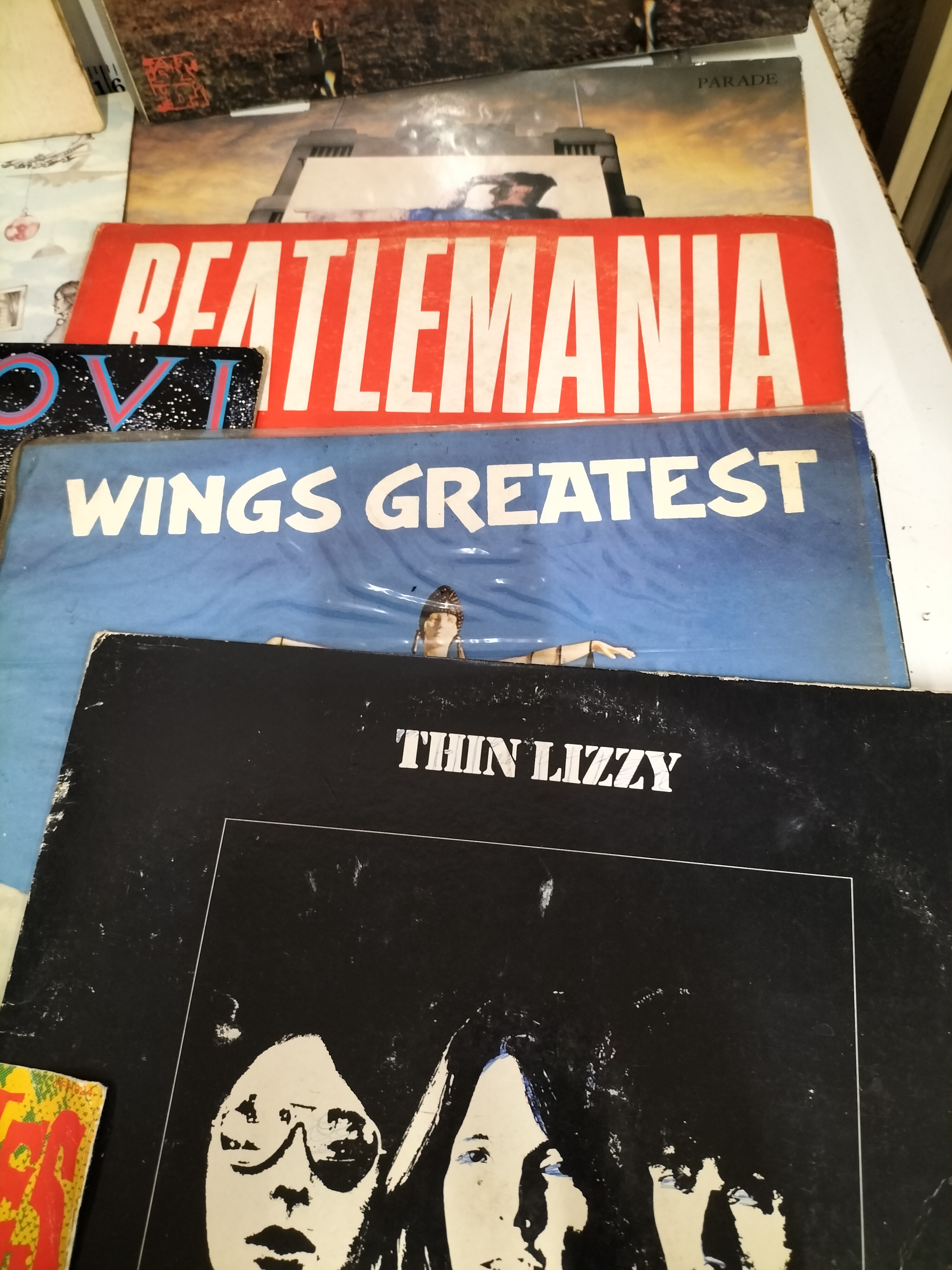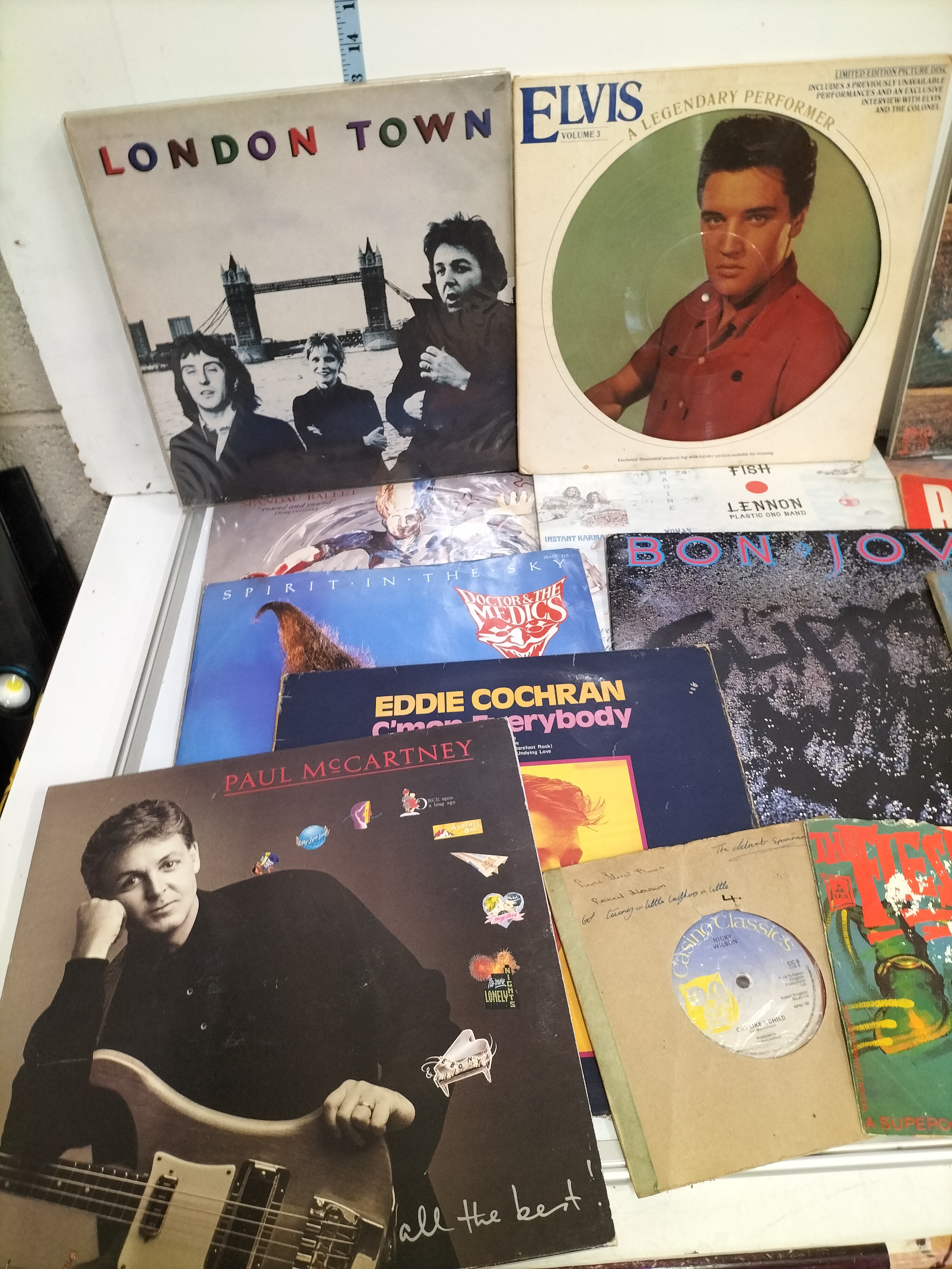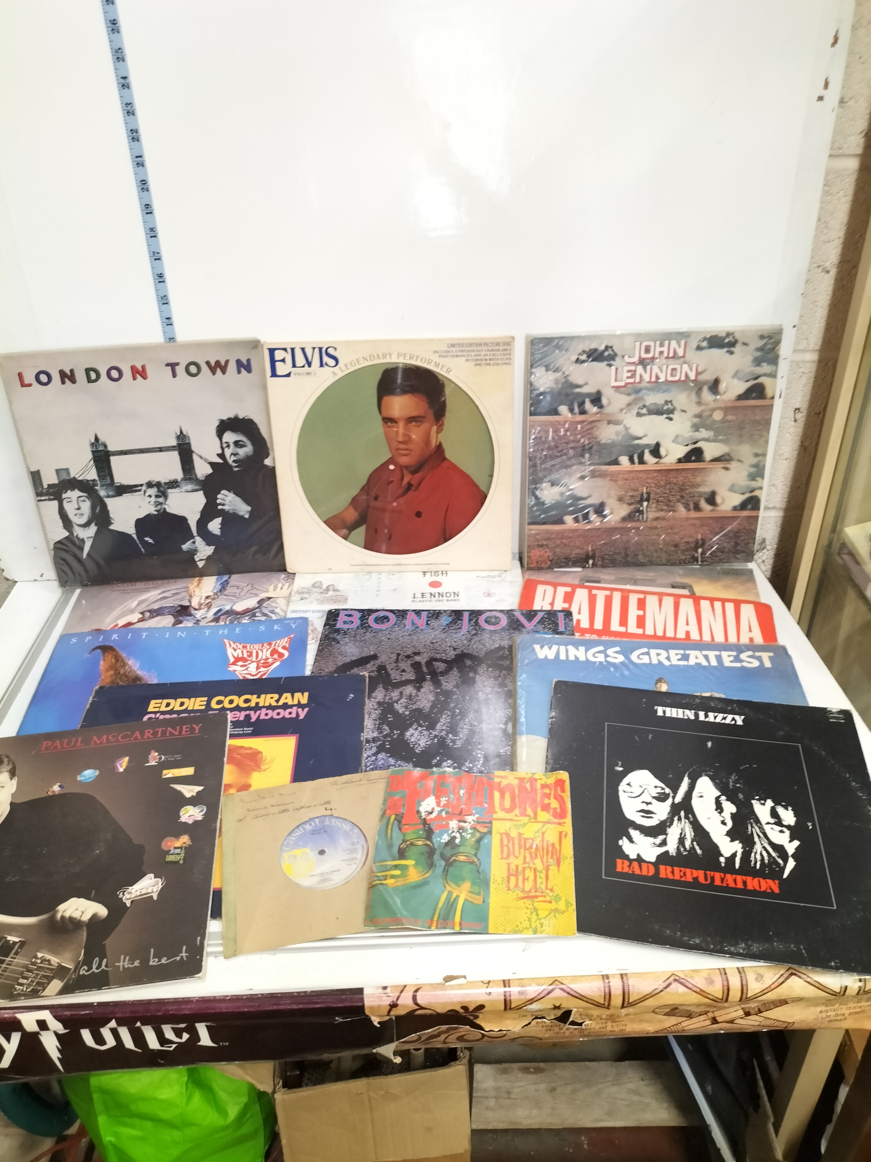 A collection of various vinyl LP and 7 inch records featuring artists such as Elvis Presley, Thin Lizzy, Paul McCartney, and Bon Jovi.