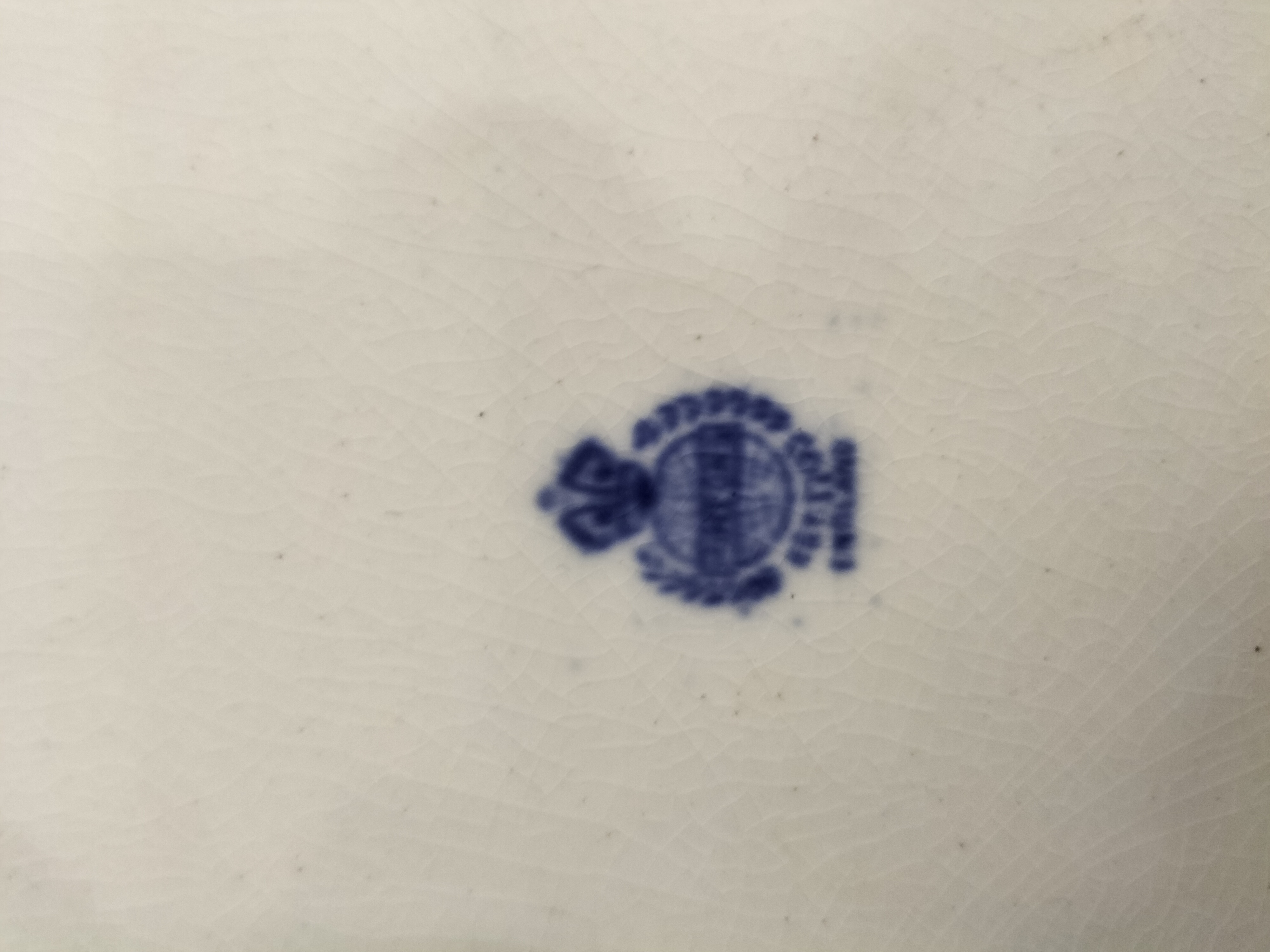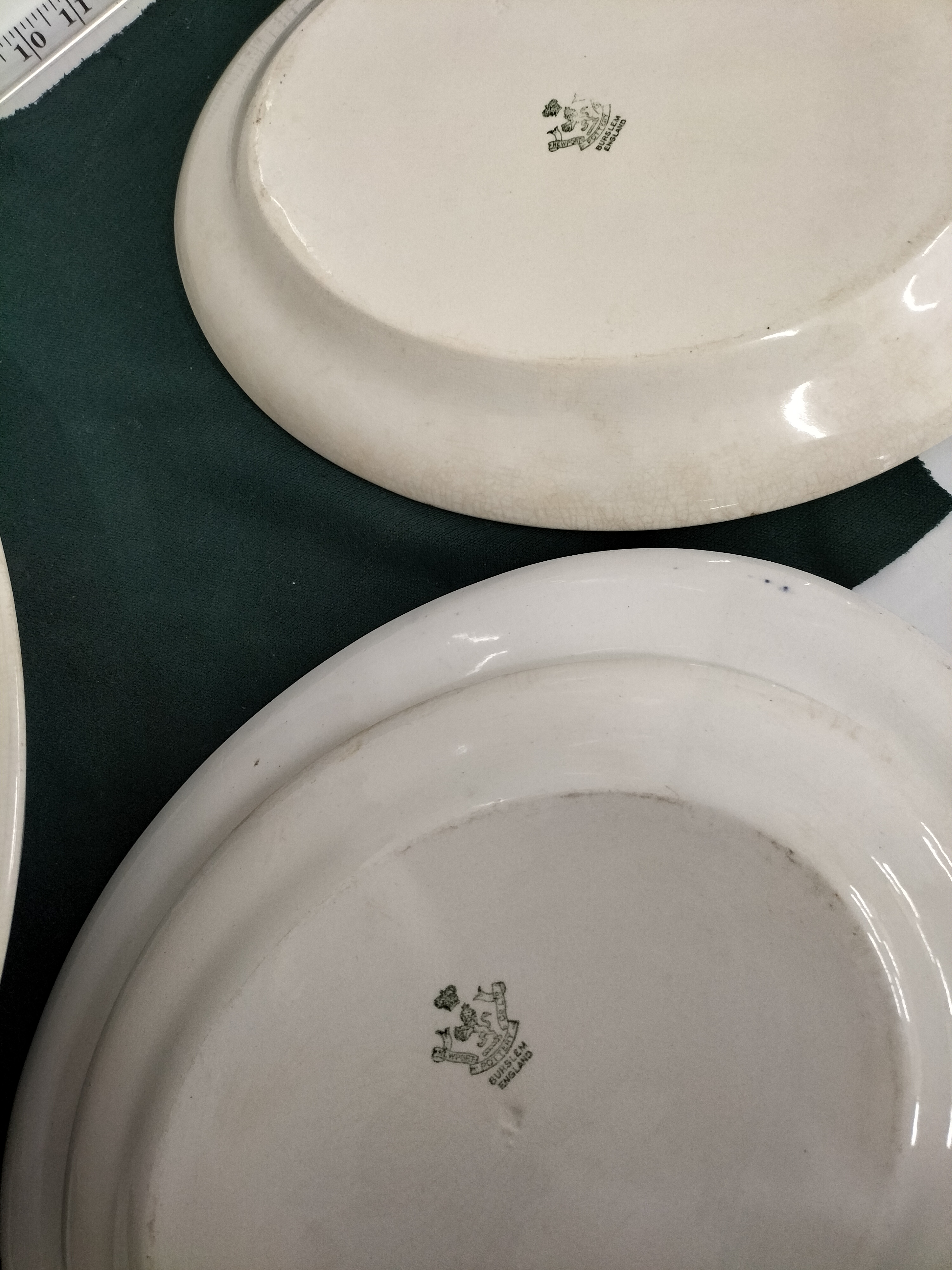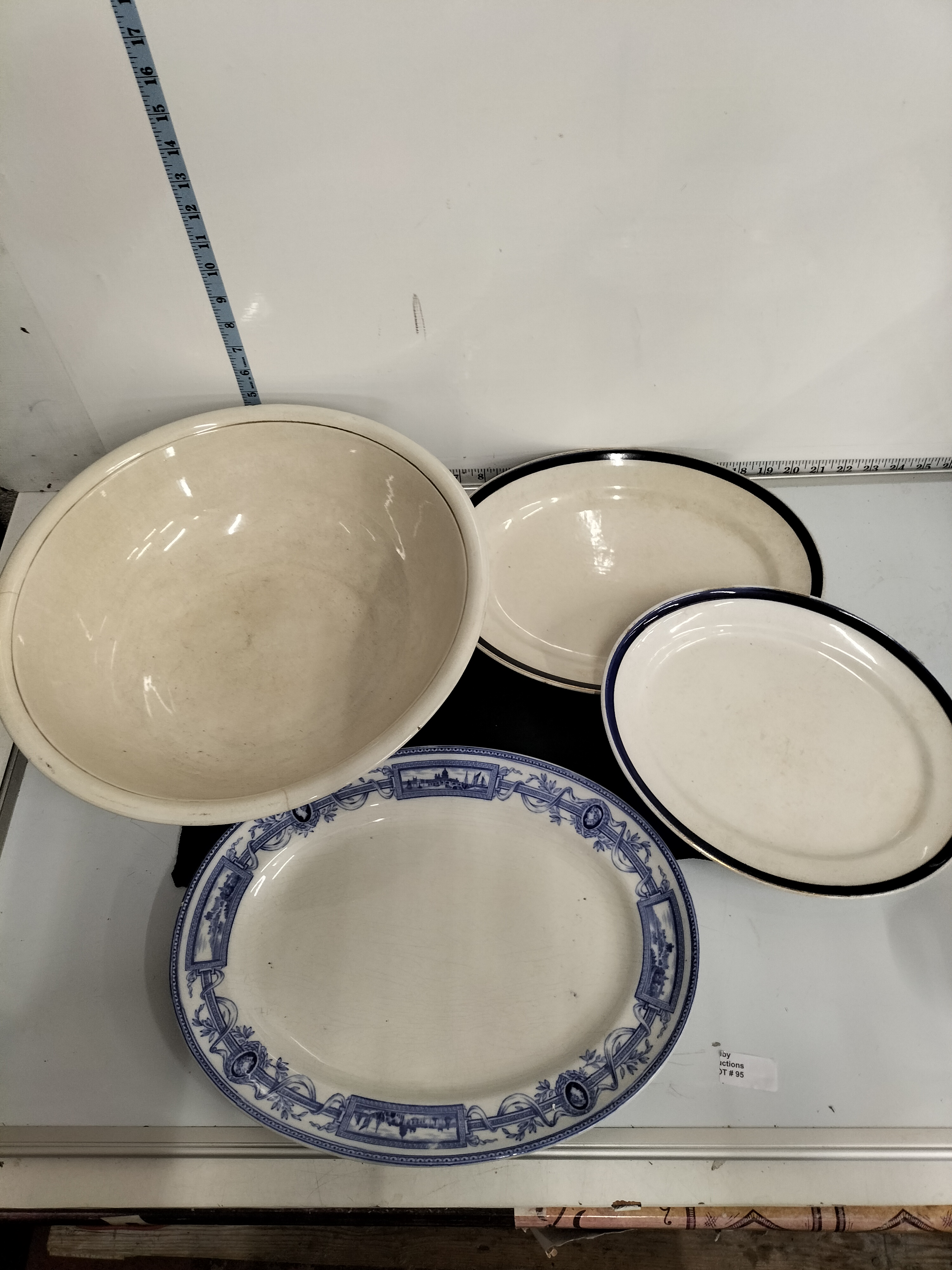 A group of ceramic items including a large mixing bowl, two Newport Pottery Burslem oval plates with dark rims, and a large blue patterned platter, with dimensions ranging from 25cm to 38cm in length.