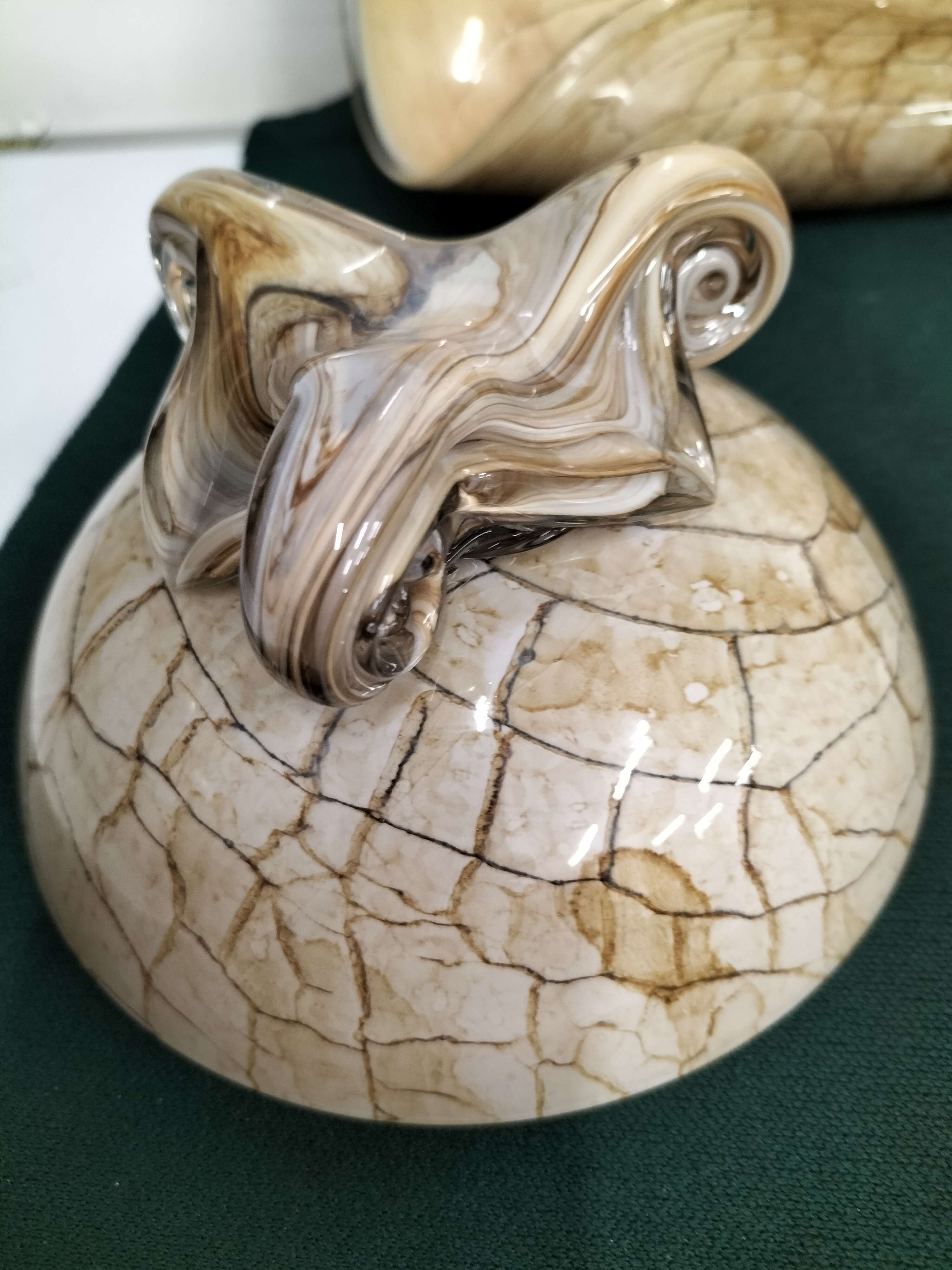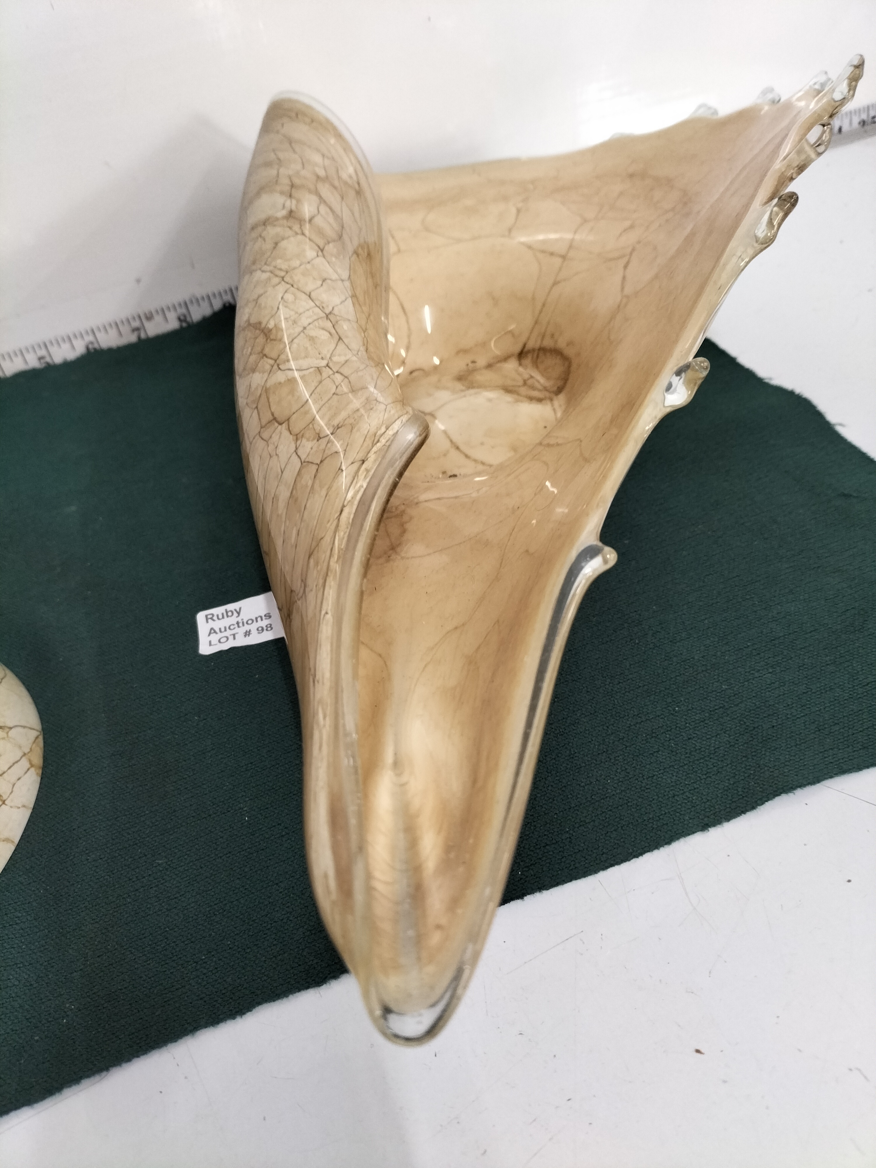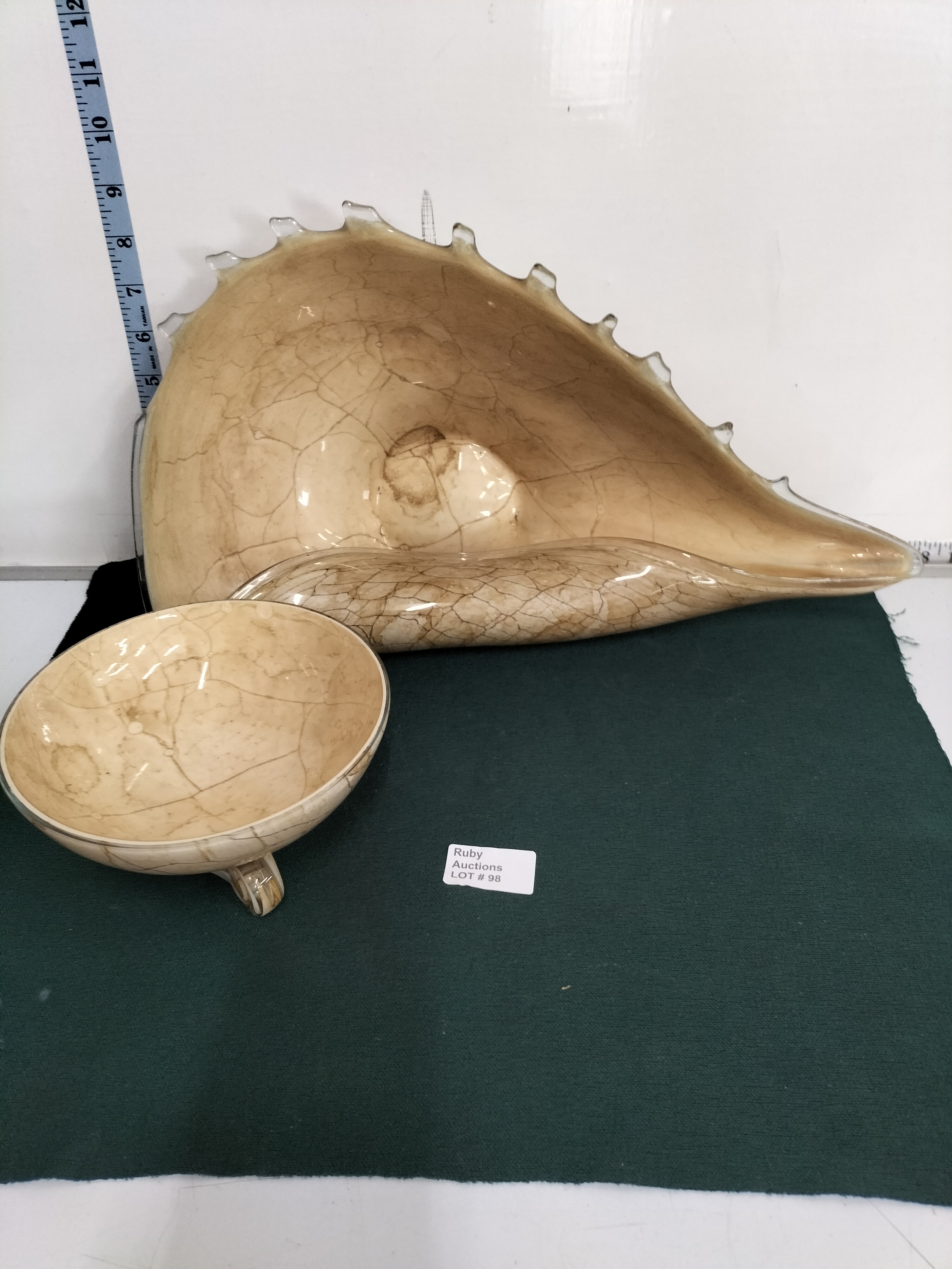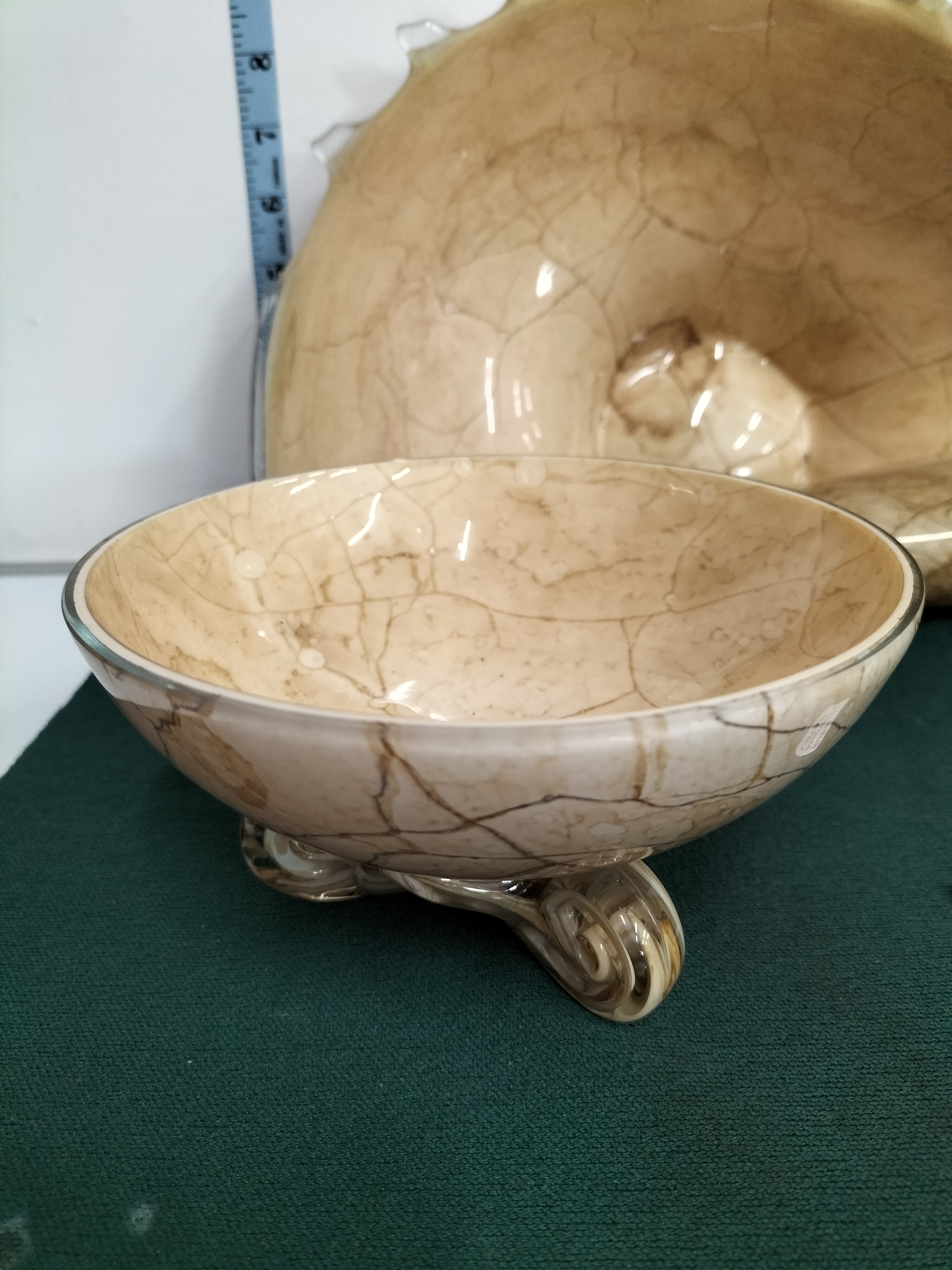 Two decorative glass bowls featuring a beige colour with brown marbled veining, including a shell-shaped piece measuring approximately 15 inches long and a smaller footed bowl.
